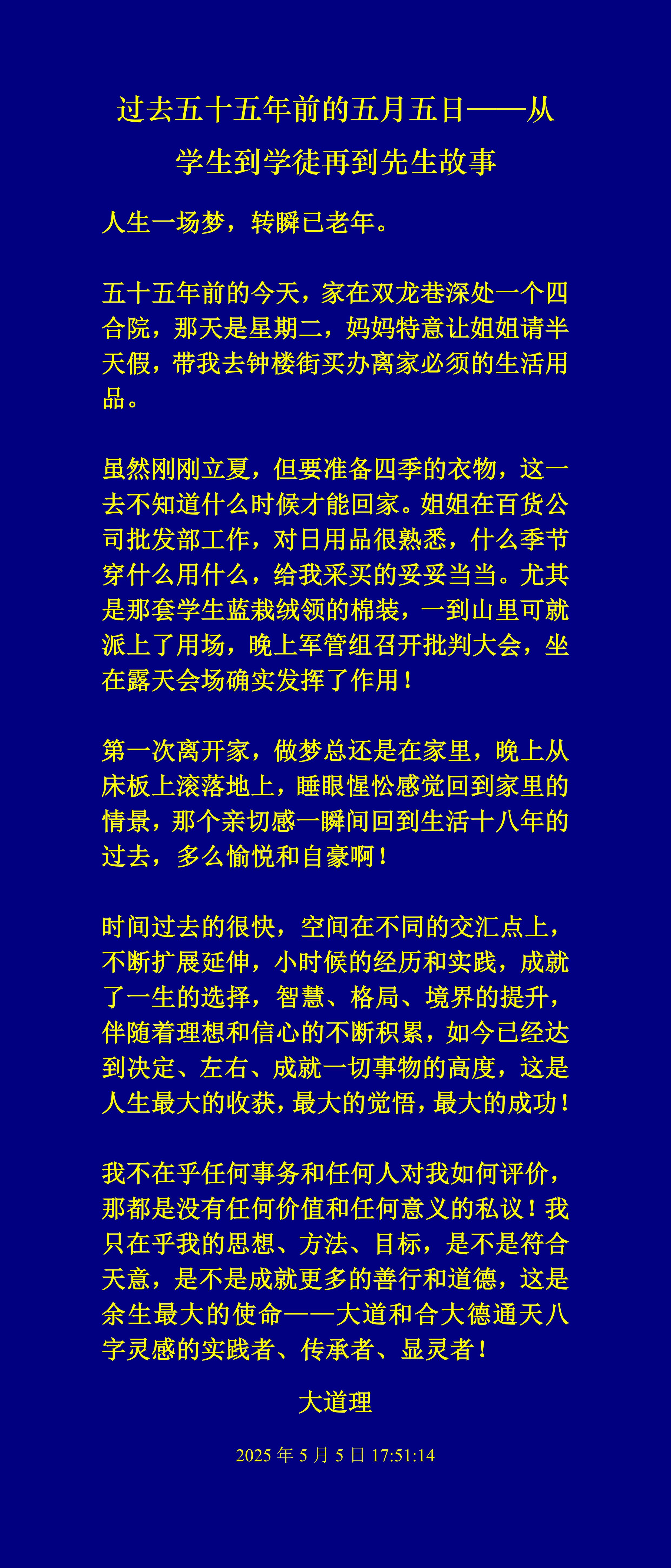 我不在乎任何事務(wù)和任何人對(duì)我如何評(píng)價(jià),那都是沒有任何價(jià)值和意義的私議!我只在乎我的思想、方法、目標(biāo),是不是符合天意,是不是成就更多的善行和道德,這是余生最大的使命——大道和合大德通天八字靈感的實(shí)踐者、傳承者、顯靈者!