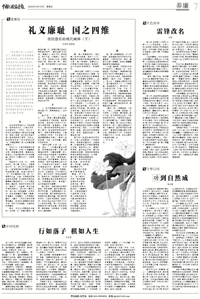 《管子》曰:“何謂四維?一曰禮,二曰義,三曰廉,四曰恥,禮不逾節(jié),義不自進,廉不蔽惡,恥不從枉。故不逾節(jié)則上位安,不自進則民無巧詐,不蔽惡則行自全,不從枉則邪事不生。”如果大家都做到了禮義廉恥,那么社會上下就會秩序井然,每個人都會加強自我約束,爾虞我詐、歪風邪氣自然也就沒有了。管仲的這段著名言論流傳千古,即使是到了今天,這段話依然道出了對個人修身、社會發(fā)展十分有益的見解,讓人深受啟發(fā)。