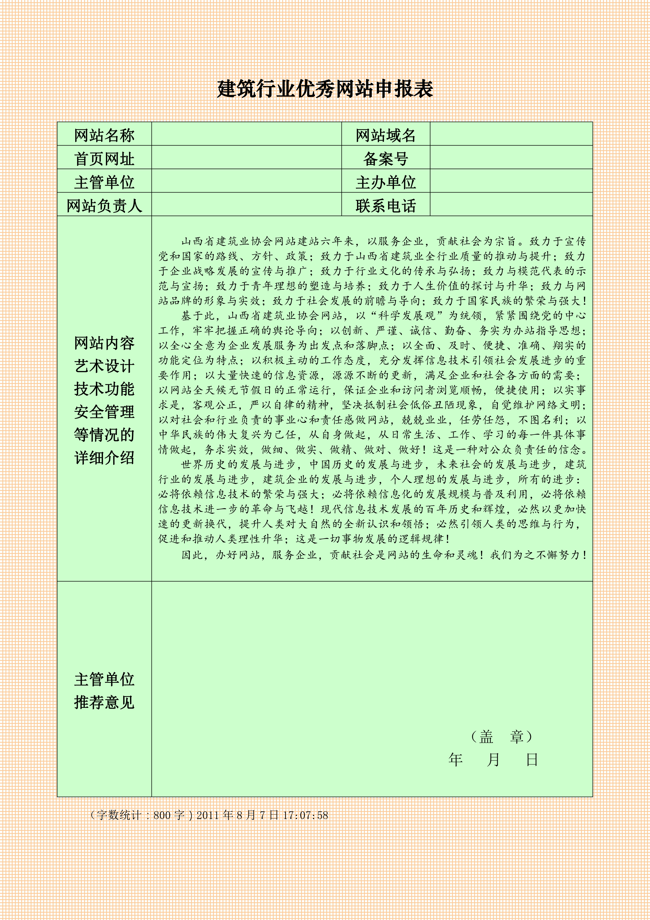 這是2011年在協(xié)會(huì)負(fù)責(zé)網(wǎng)站工作時(shí),我親自撰寫的申報(bào)“全國建筑行業(yè)精品和優(yōu)秀網(wǎng)站”的文稿,要求內(nèi)容用五號楷體限制在800字。