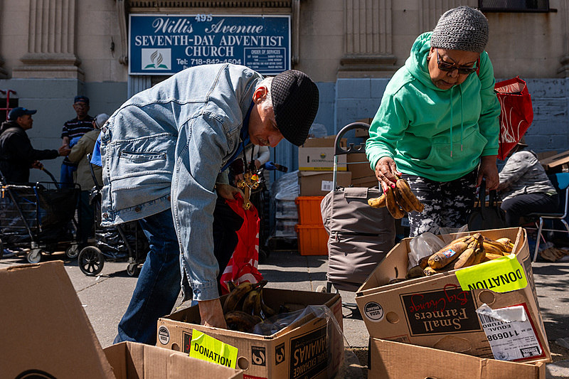 當(dāng)?shù)貢r間2025年4月23日,美國紐約,民眾在布朗克斯一座教堂外領(lǐng)取食物。 視覺中國