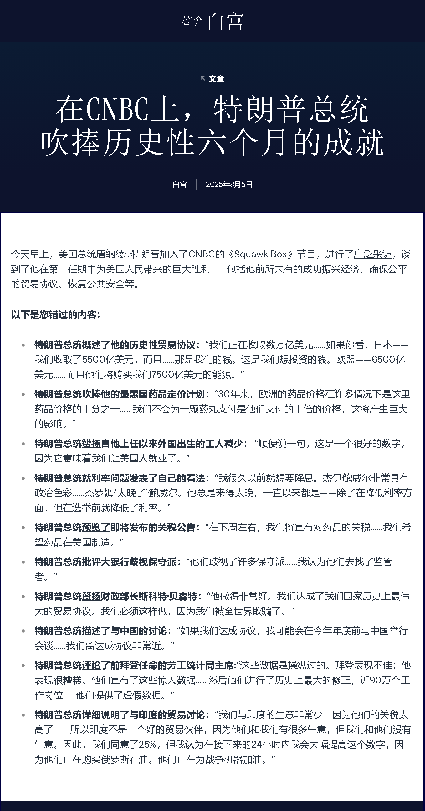 今天早上,美國總統(tǒng)唐納德·J·特朗普加入了CNBC的《Squawk Box》節(jié)目,進行了廣泛采訪,談到了他在第二任期中為美國人民帶來的巨大勝利——包括他前所未有的成功振興經(jīng)濟、確保公平的貿(mào)易協(xié)議、恢復公共安全等。