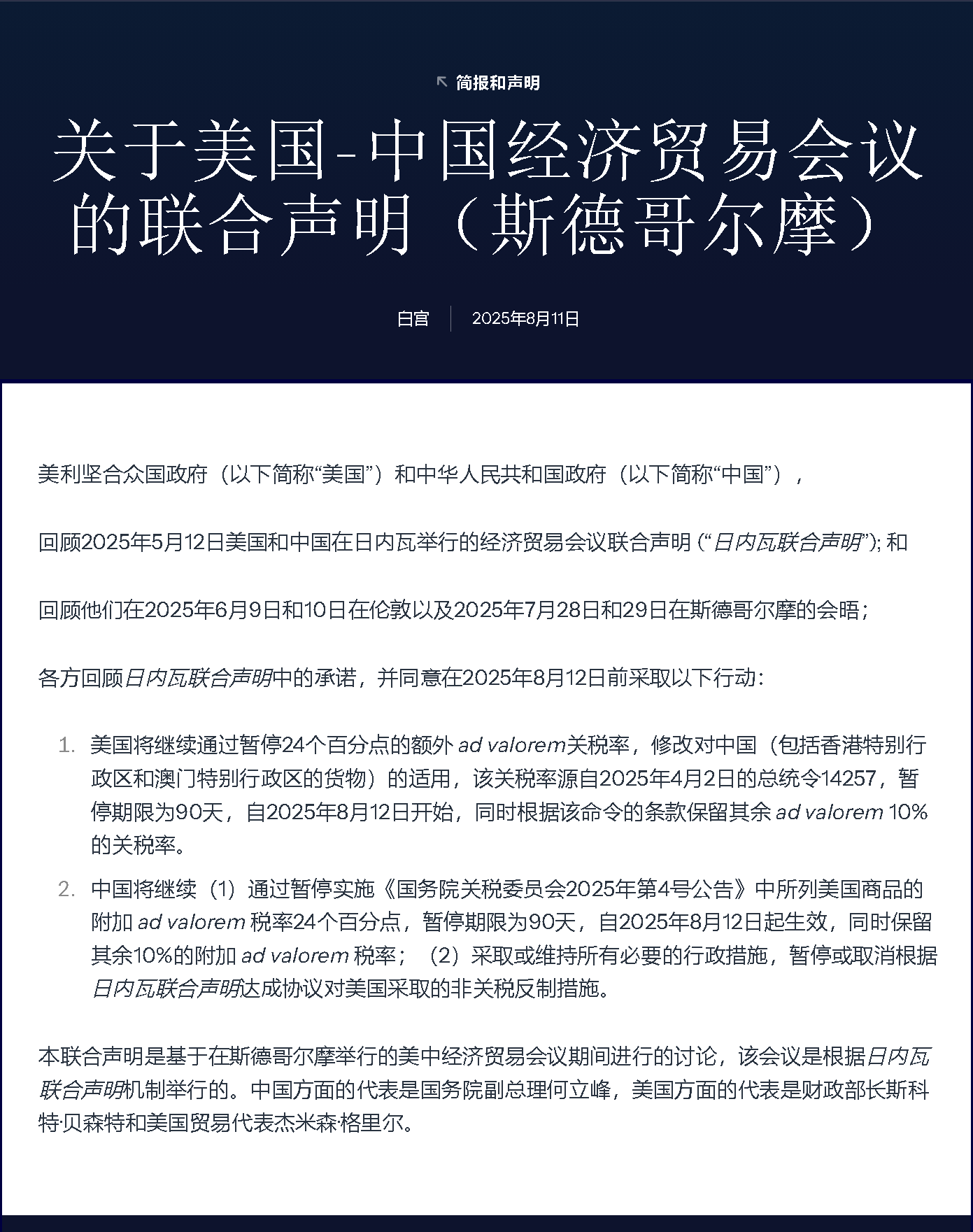 本聯(lián)合聲明是基于在斯德哥爾摩舉行的美中經(jīng)濟(jì)貿(mào)易會(huì)議期間進(jìn)行的討論,該會(huì)議是根據(jù)日內(nèi)瓦聯(lián)合聲明機(jī)制舉行的。中國(guó)方面的代表是國(guó)務(wù)院副總理何立峰,美國(guó)方面的代表是財(cái)政部長(zhǎng)斯科特·貝森特和美國(guó)貿(mào)易代表杰米森·格里爾。