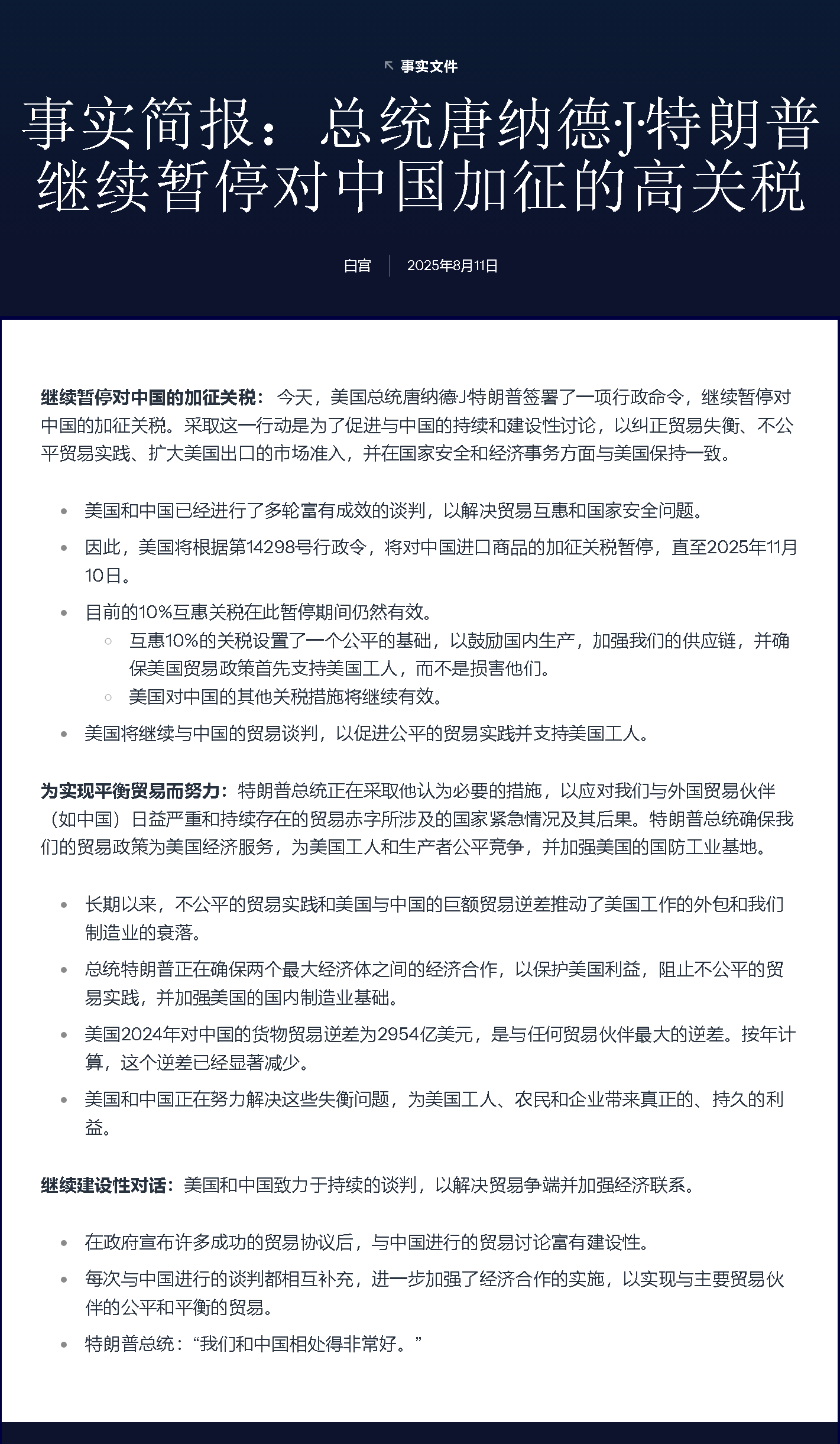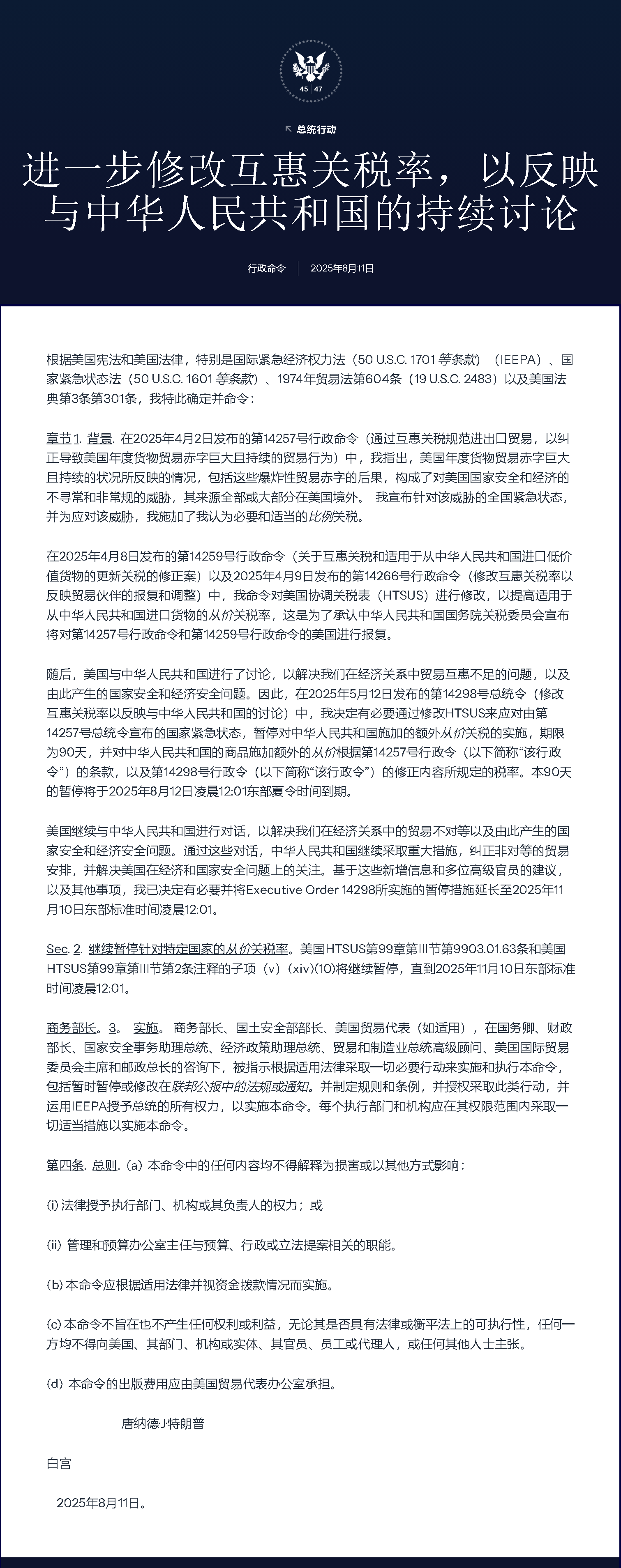 美國(guó)繼續(xù)與中華人民共和國(guó)進(jìn)行對(duì)話,以解決我們?cè)诮?jīng)濟(jì)關(guān)系中的貿(mào)易互惠性不足問題,以及由此產(chǎn)生的國(guó)家安全和經(jīng)濟(jì)安全問題。通過(guò)這些對(duì)話,中華人民共和國(guó)繼續(xù)采取重大措施,糾正非互惠貿(mào)易安排,并解決美國(guó)在經(jīng)濟(jì)和國(guó)家安全問題上的關(guān)切?;谶@些新增信息和來(lái)自多位高級(jí)官員的建議,以及其他事項(xiàng),我已決定有必要并將Executive Order 14298所實(shí)施的暫停措施延長(zhǎng)至2025年11月10日東部標(biāo)準(zhǔn)時(shí)間凌晨12:01。
