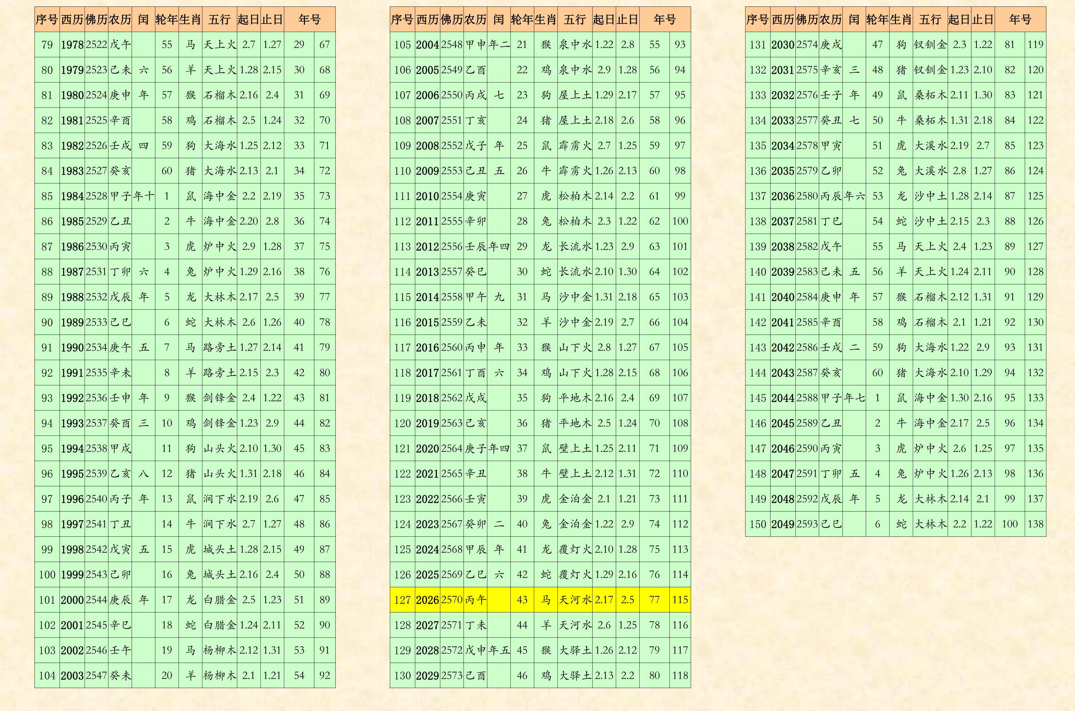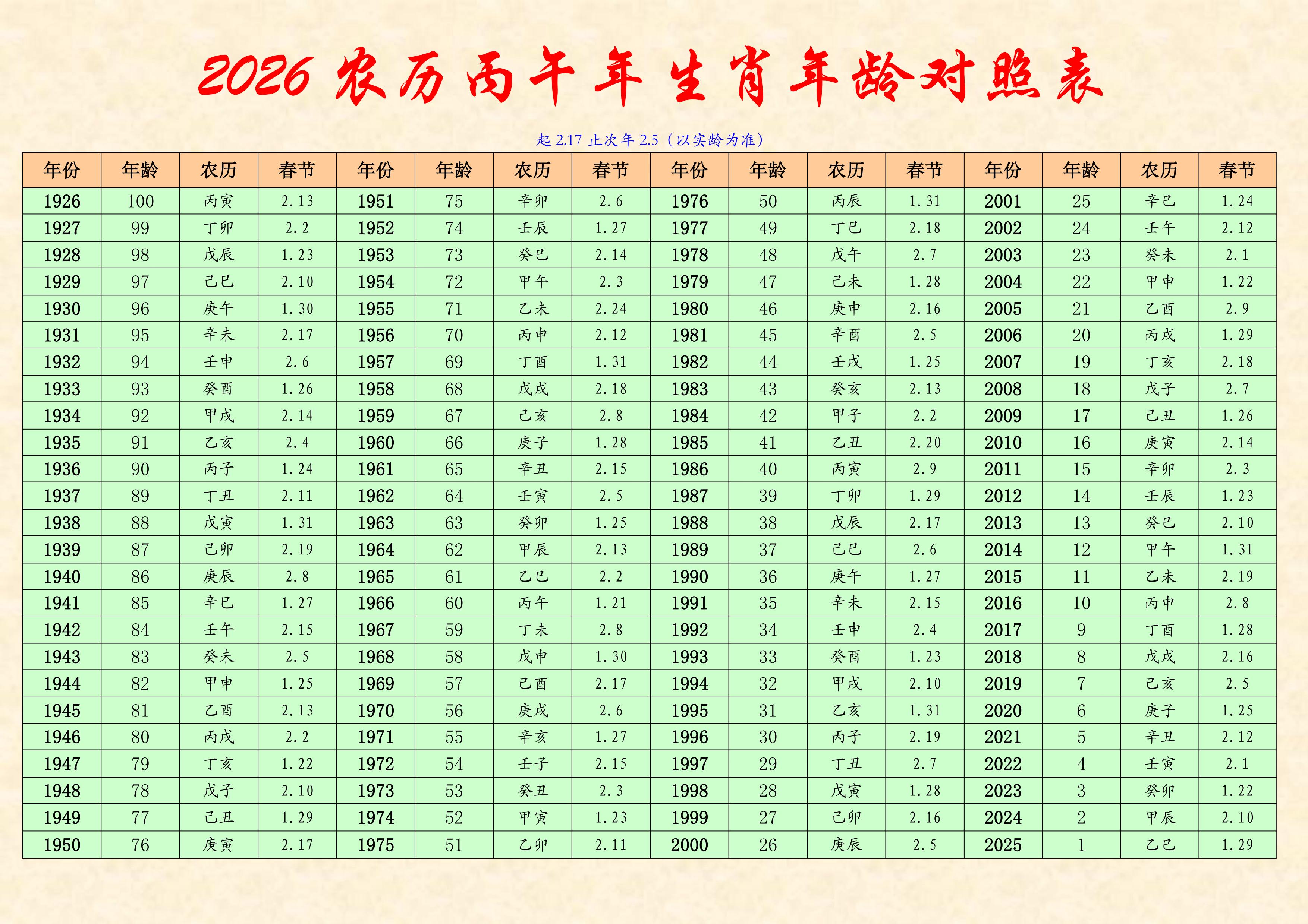 2026年農(nóng)歷丙午年生肖年齡對照表