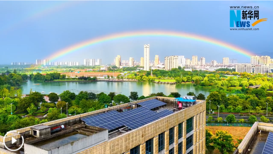 近日,雨后初霽,在安徽省銅陵市臨津湖上空出現(xiàn)短暫的彩虹景觀,似一座拱橋架在半空,與一湖碧波相互映襯,宛如畫卷。