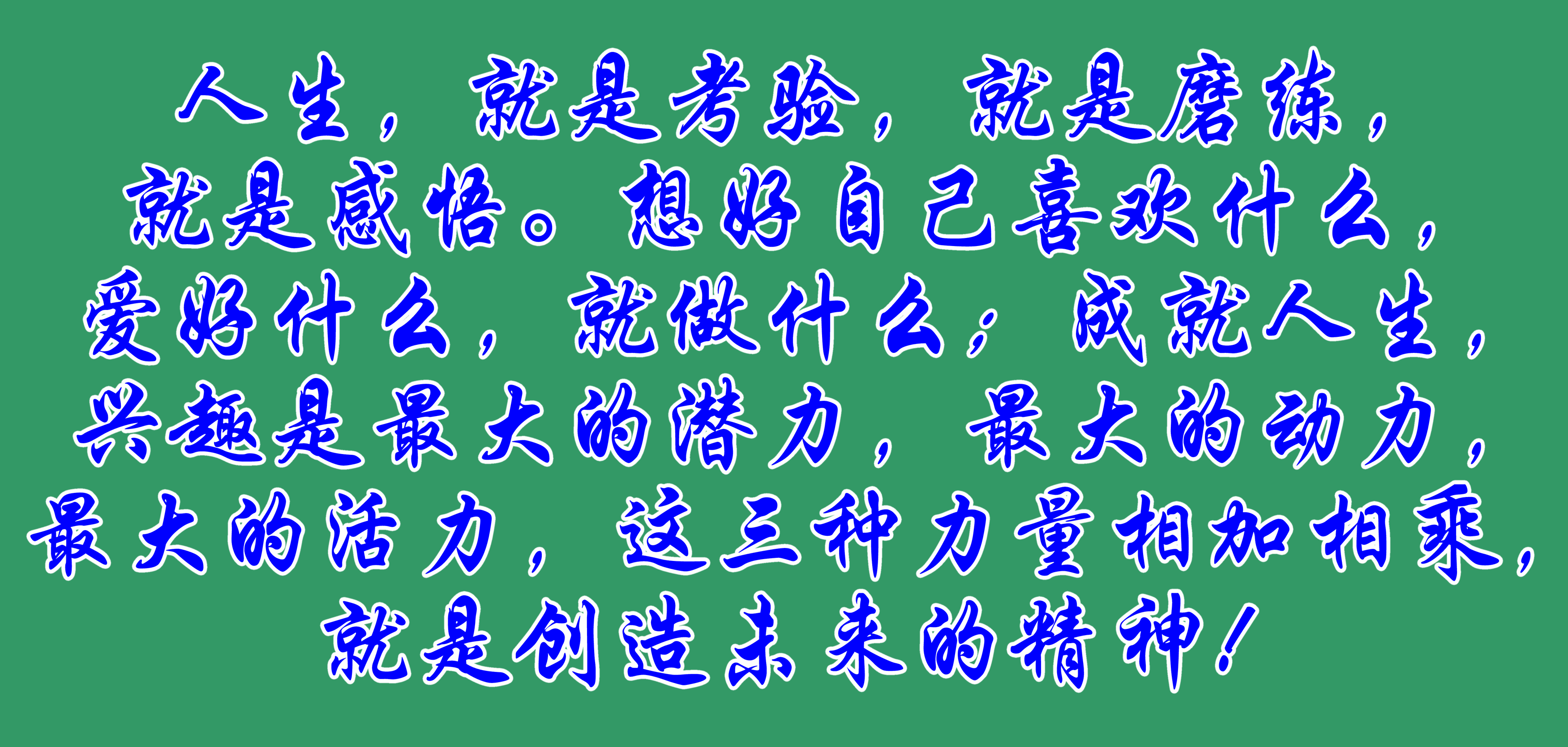 人生,就是考驗(yàn),就是磨練,就是感悟。想好自己喜歡什么,愛好什么,就做什么;成就人生,興趣是最大的潛力,最大的動(dòng)力,最大的活力,這三種力量相加相乘,就是創(chuàng)造未來的精神!