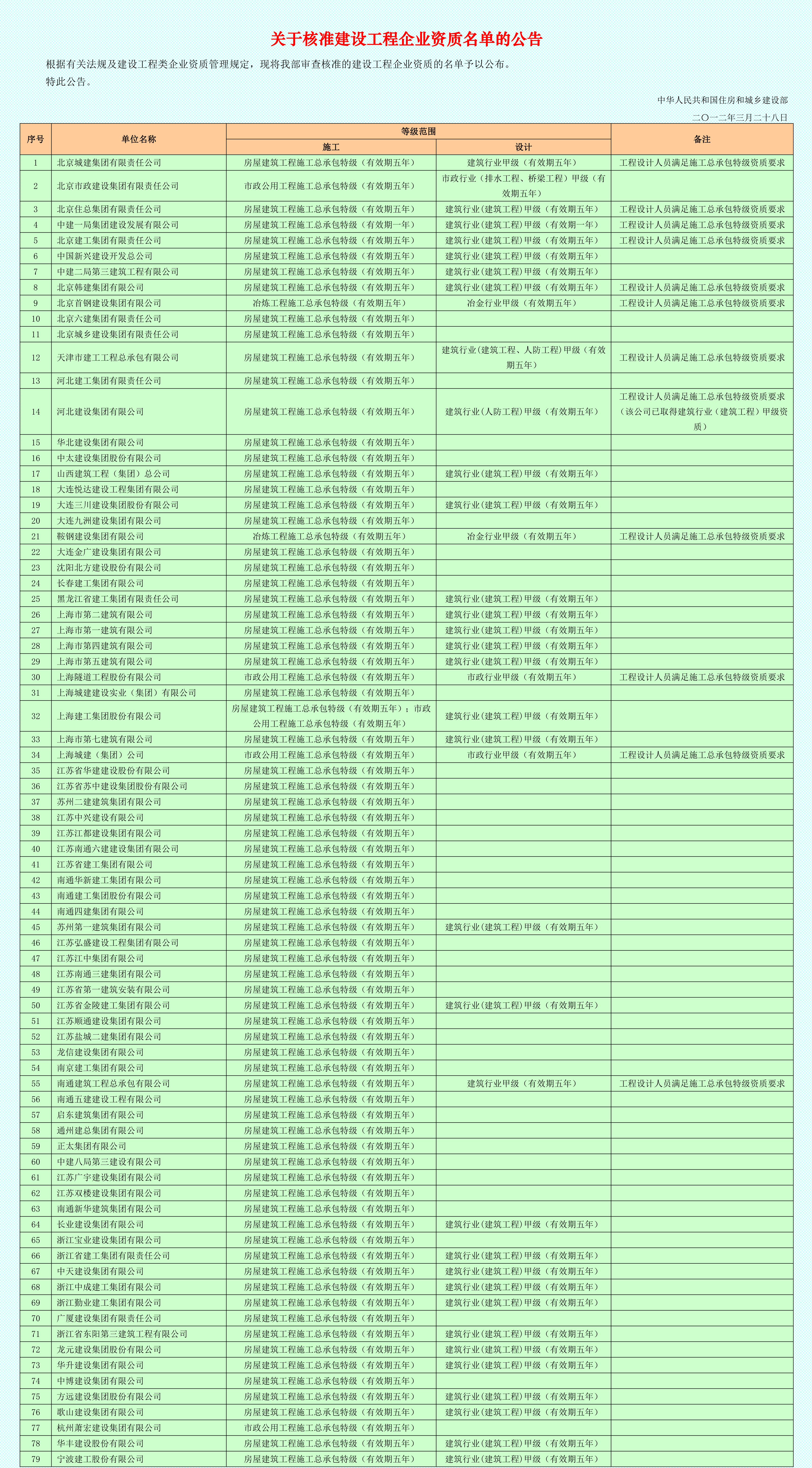 這幾天,整理行業(yè)資料,看到十二年前住建部第一次核準(zhǔn)特級(jí)資質(zhì)企業(yè)公告,貼出來和大家分享,從中感悟建筑業(yè)未來發(fā)展大趨勢(shì),我們應(yīng)該如何面對(duì)日趨激烈的行業(yè)競(jìng)爭(zhēng)新形勢(shì),如何發(fā)揮戰(zhàn)略引領(lǐng)做大做強(qiáng),贏得未來更大的發(fā)展空間!
