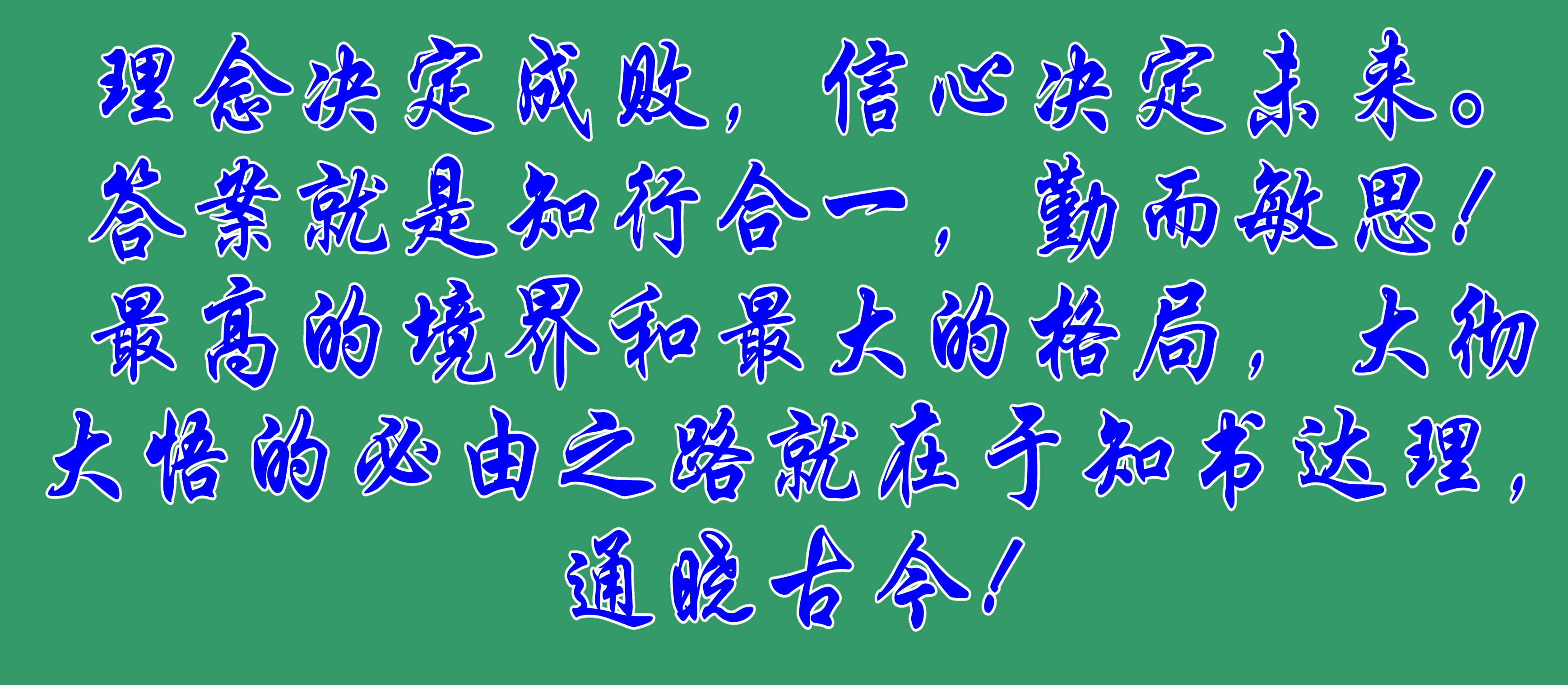理念決定成敗,信心決定未來。答案就是知行合一,勤而敏思!最高的境界和最大的格局,大徹大悟的必由之路就在于知書達(dá)理,通曉古今!