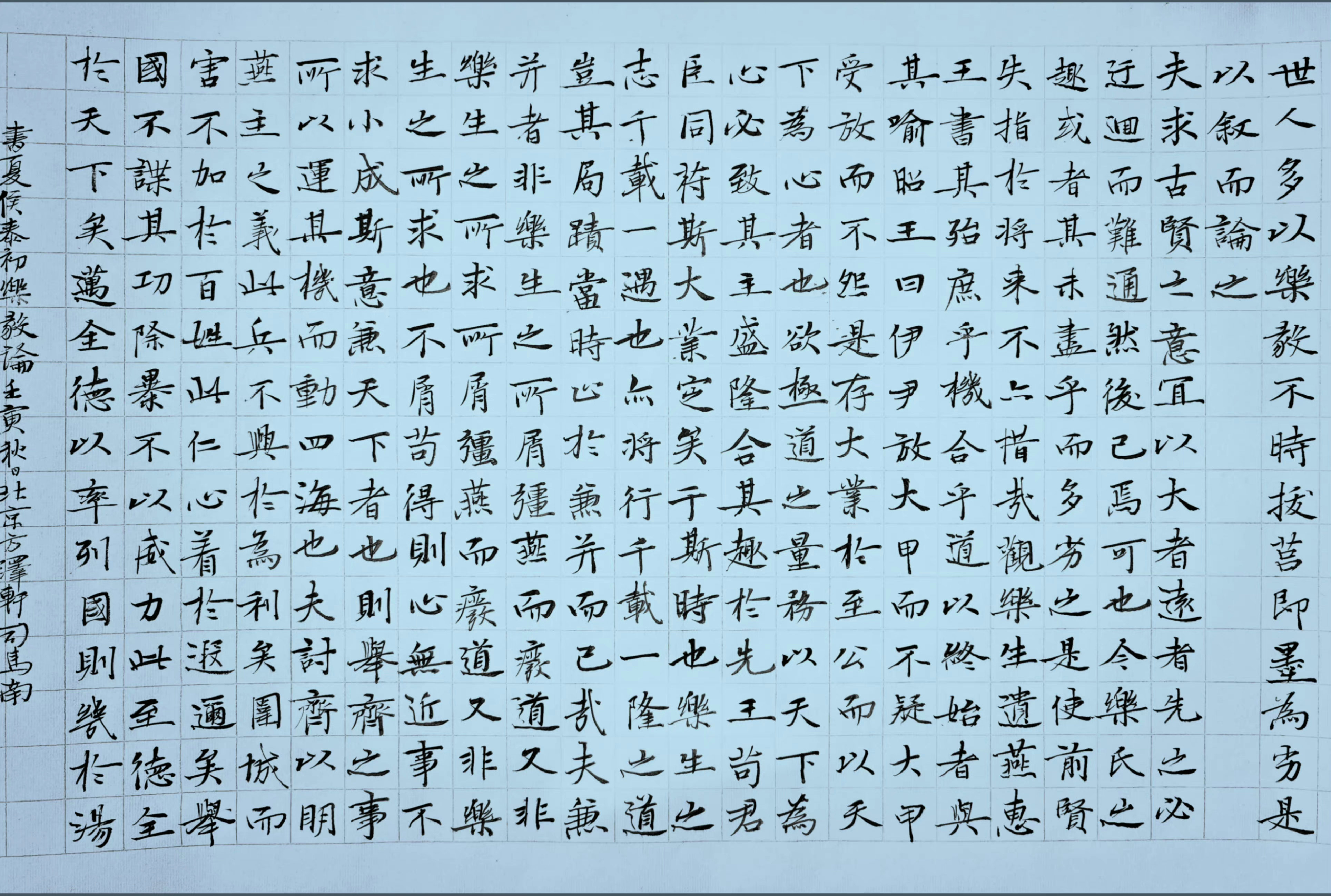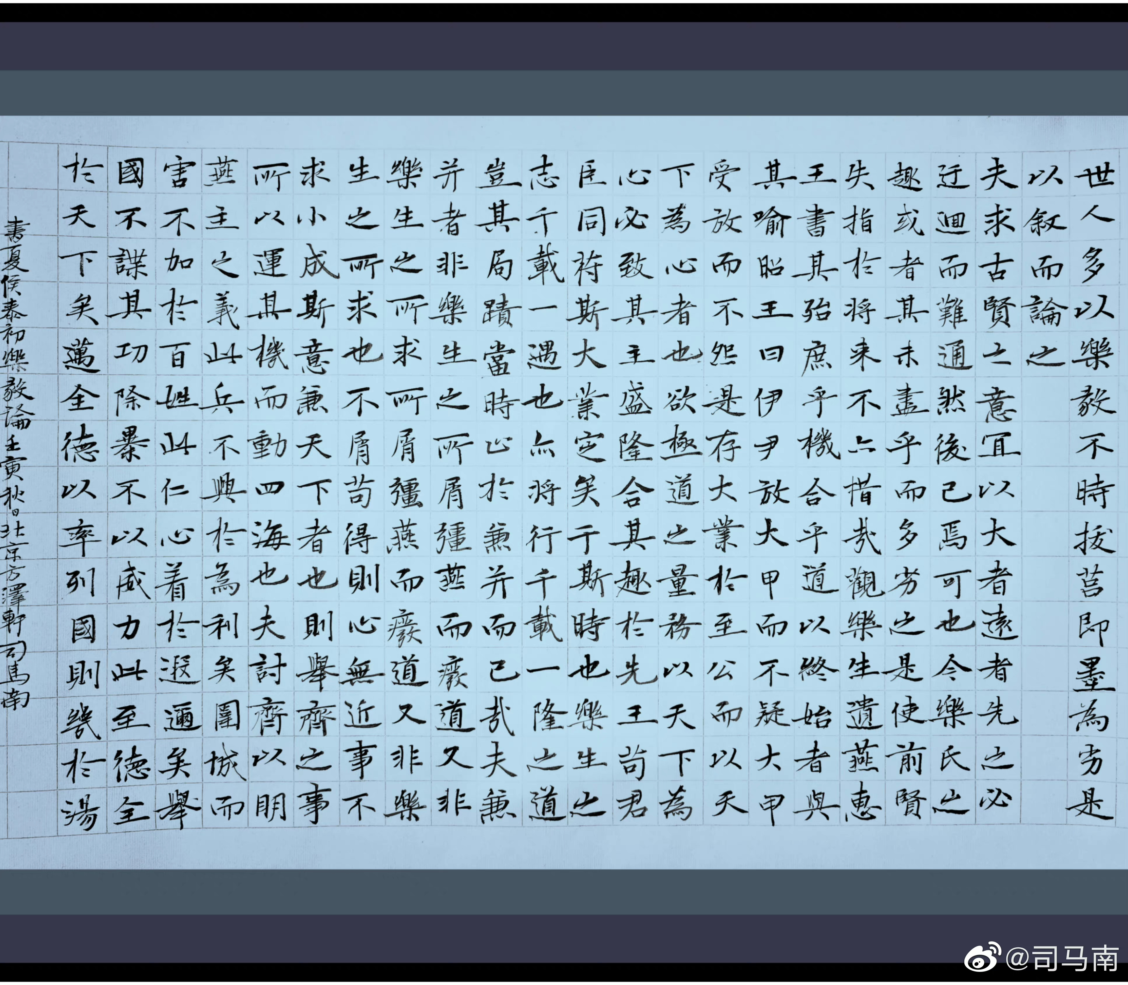 行為端莊,舉止大方的人,一般寫字中規(guī)中矩,秀氣,大氣。整篇文字相互呼應,墨跡均勻,布白勻稱,一氣呵成。給人以厚重沉穩(wěn),大度祥和之感,這是書法的最高境界了!