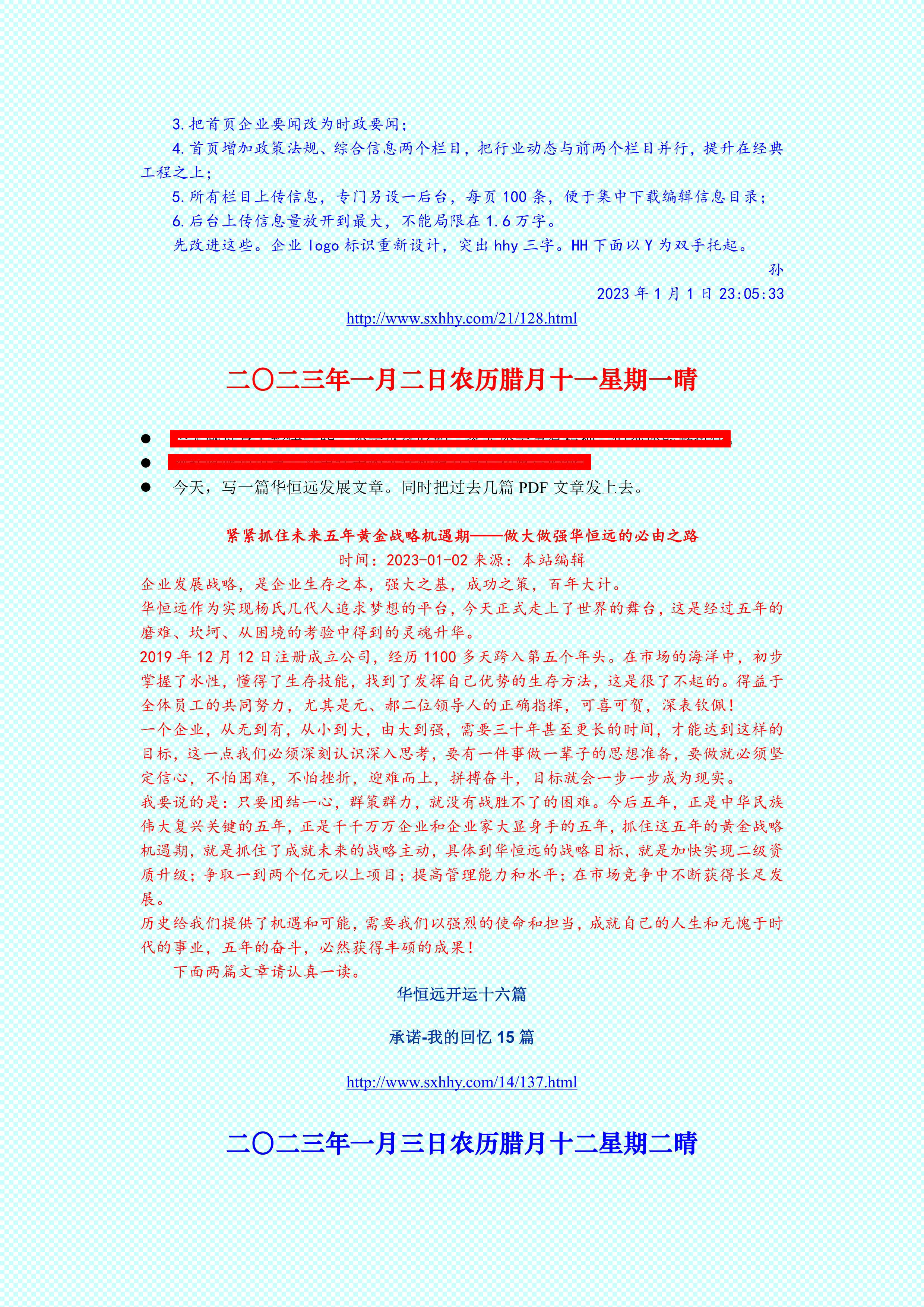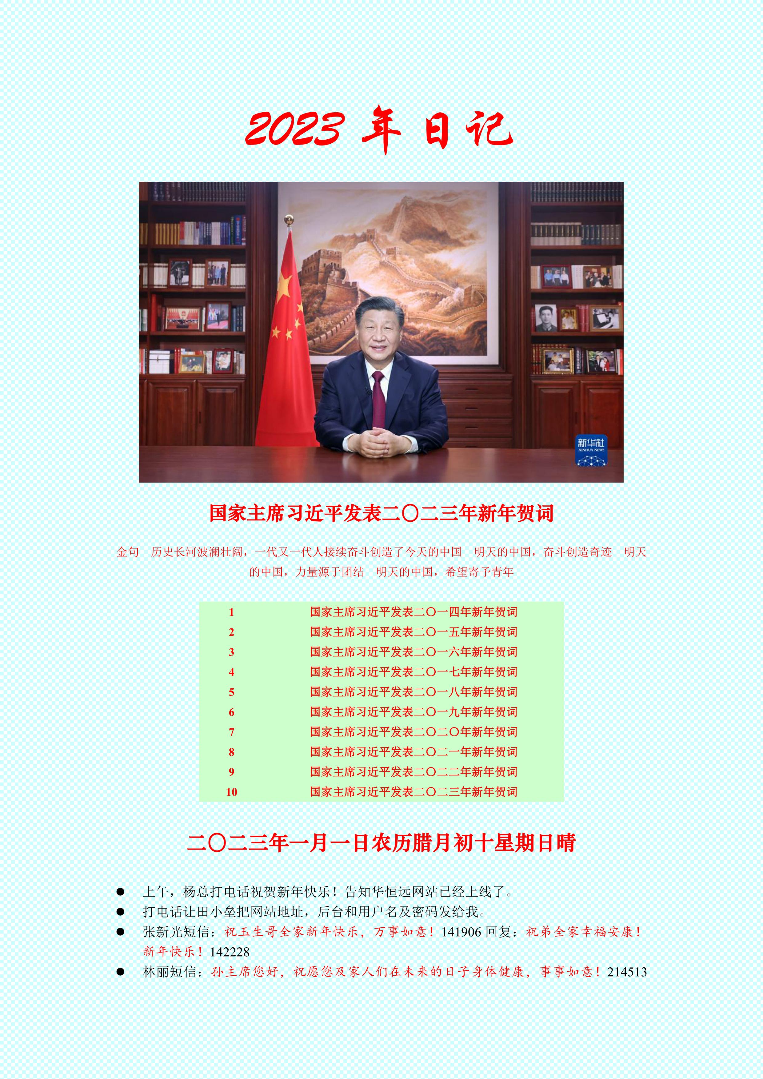 下面是2023年我的日記第一天和第二天,帖出來與華恒遠的創(chuàng)業(yè)者分享,拋磚引玉,提升寫日記的感悟、感應和靈感,讓自己的靈性釋放,理想奔放,信心倍增,如此才是行之有效的啟發(fā)和教化!