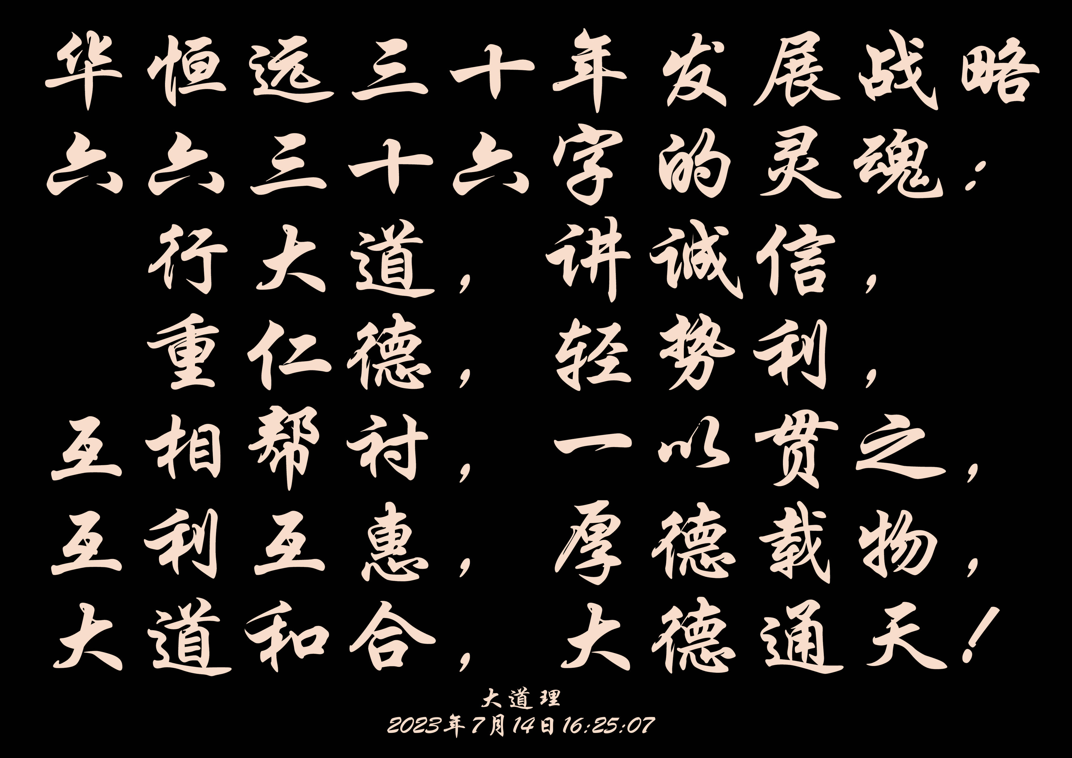 我們制定華恒遠三十年發(fā)展戰(zhàn)略規(guī)劃,是從著眼當下展望未來的高度,從符合實際的角度,適合自己的深度,知近觀遠,統(tǒng)籌兼顧;既不急功近利,也不急于求成,還不好大喜功,更不鋌而走險,決不畏縮不前,這五個“不”,來衡量和考慮。同時,要堅持一貫:做有準備的事,做有把握的事,做有前途的事,做有利人的事,做有利己的事;這五個“做”,即彰現(xiàn)華恒遠企業(yè)文化的追求,又昭示華恒遠企業(yè)發(fā)展戰(zhàn)略六六三十六字的靈魂:行大道,講誠信,重仁德,輕勢利,互相幫襯,一以貫之,互利互惠,厚德載物,大道和合,大德通天!