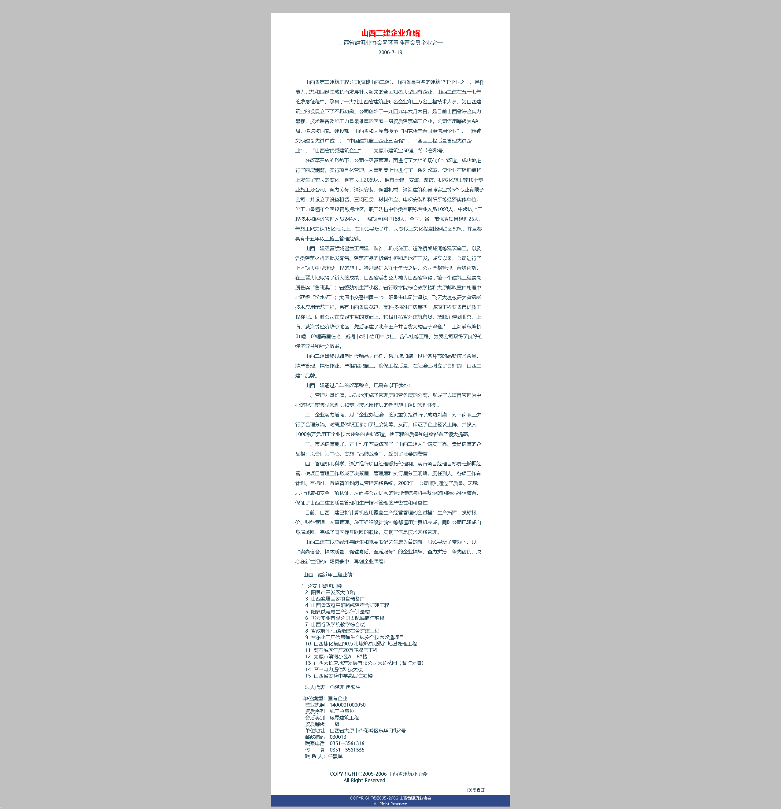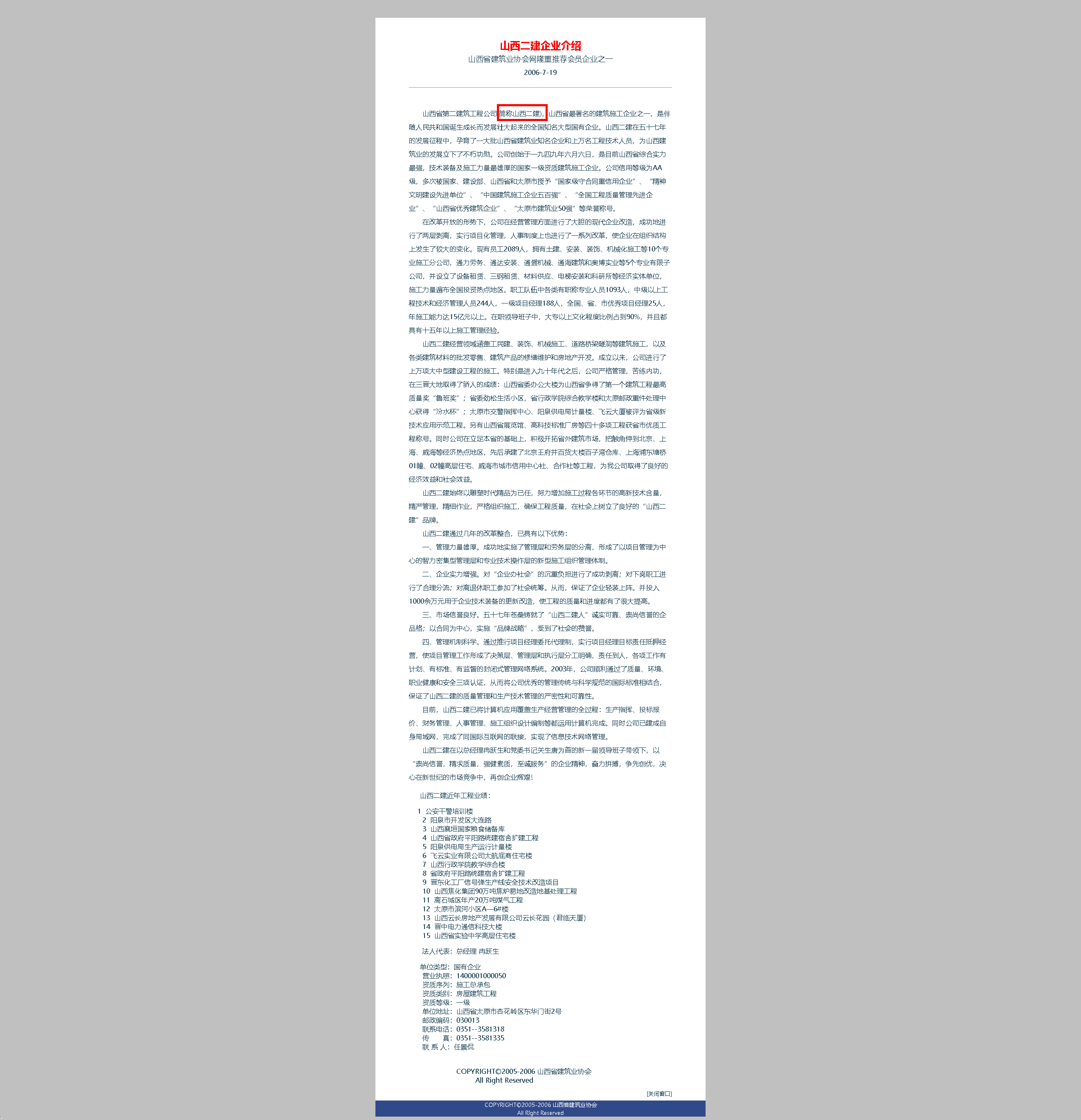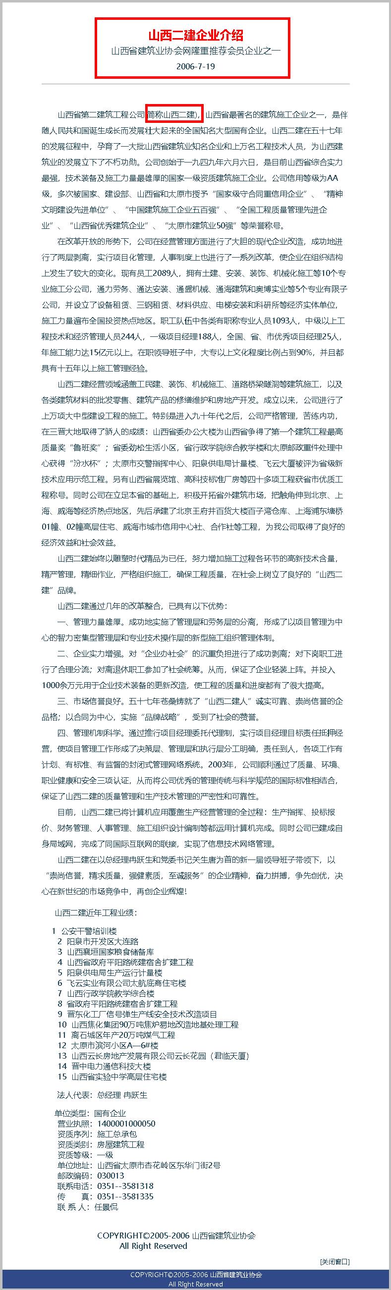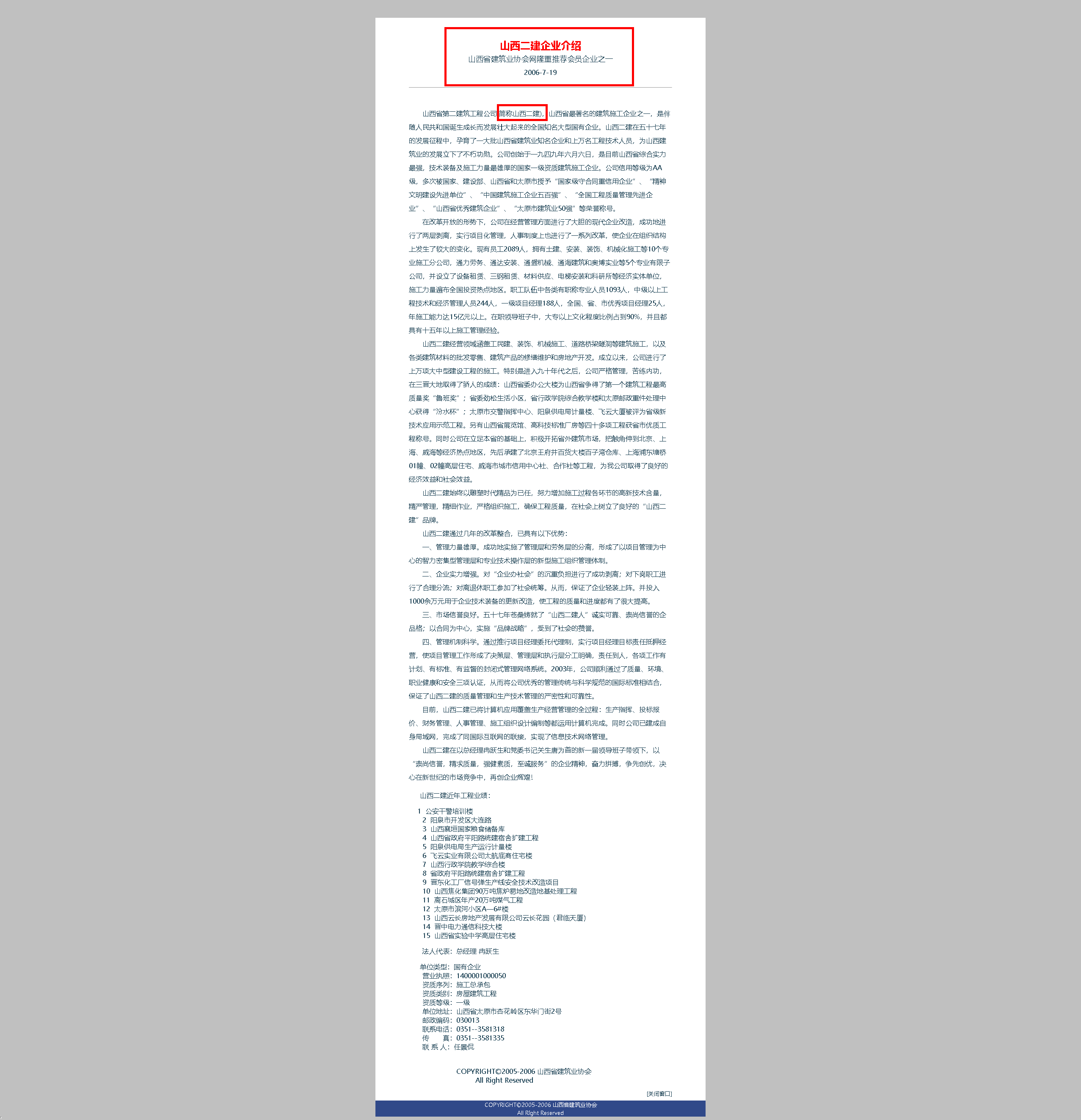 你看看我是如何推薦我的母企的,是協(xié)會作為宣傳會員企業(yè)的第一家,尤其是我劃了紅框的“山西二建”,更是歷史上第一次這么稱呼,十年后2016年1月5日的山西二建集團有限公司揭牌儀式,正是那時候就開始謀劃的!