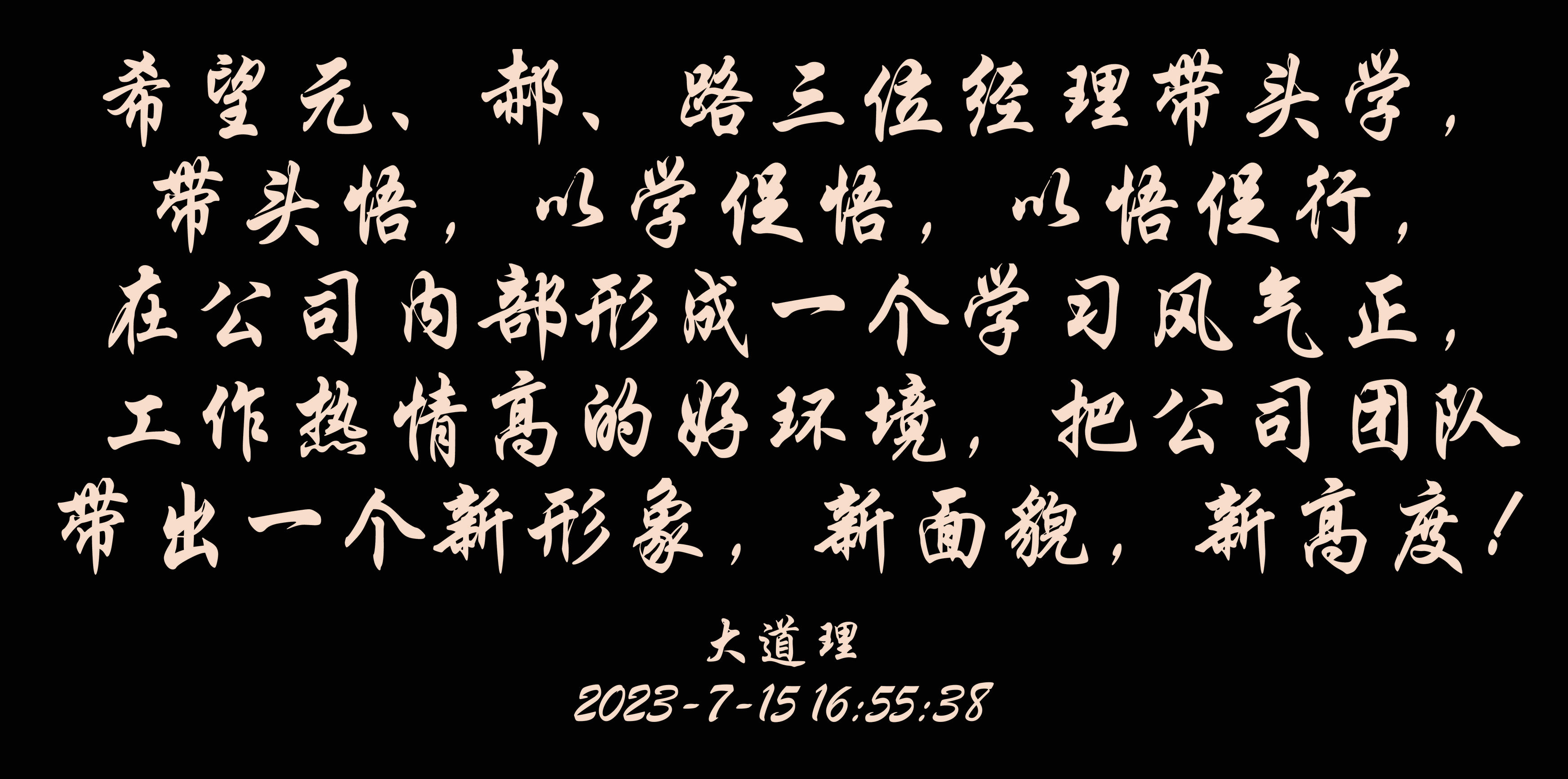 認(rèn)真學(xué)習(xí)總書記講話精神,深刻領(lǐng)會(huì)講話核心內(nèi)涵和要義,提高理解能力和執(zhí)行能力,把華恒遠(yuǎn)建設(shè)好是學(xué)習(xí)根本要求,希望元、郝、路三位經(jīng)理帶頭學(xué),帶頭悟,以學(xué)促悟,以悟促行,在公司內(nèi)部形成一個(gè)學(xué)習(xí)風(fēng)氣正,工作熱情高的好環(huán)境,把公司團(tuán)隊(duì)帶出一個(gè)新形象,新面貌,新高度!