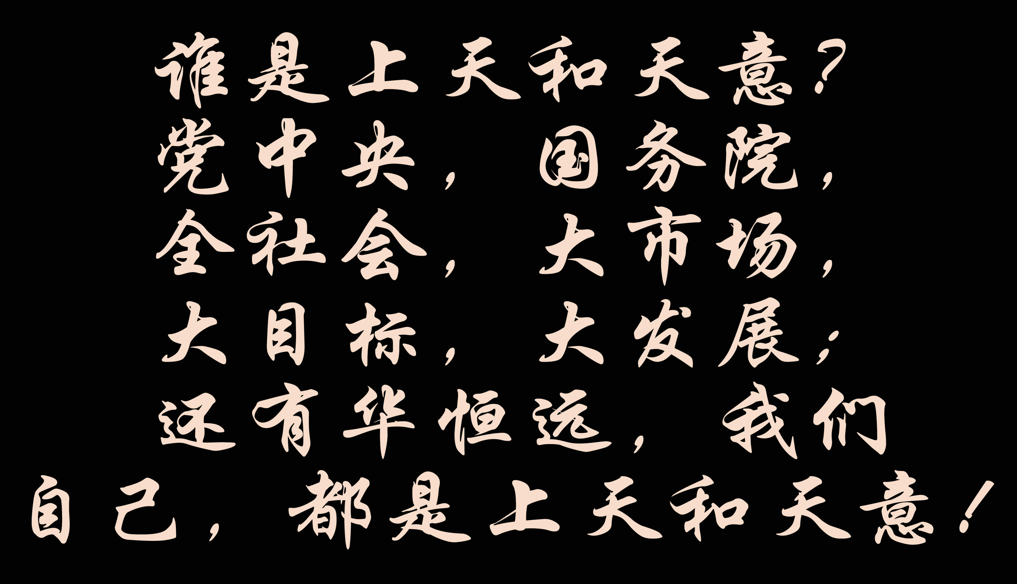 誰是上天和天意?黨中央,國務(wù)院,全社會(huì),大市場,大目標(biāo),大發(fā)展;還有華恒遠(yuǎn),我們自己,都是上天和天意!