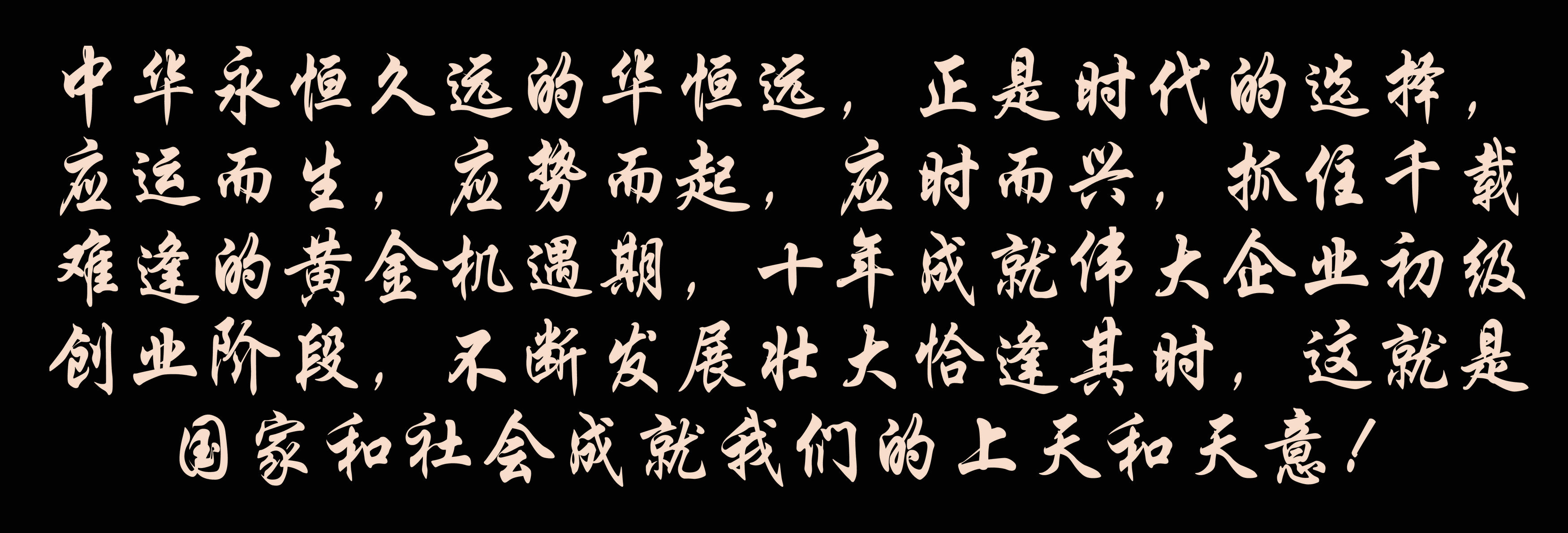 中華永恒久遠(yuǎn)的華恒遠(yuǎn),正是時(shí)代的選擇,應(yīng)運(yùn)而生,應(yīng)勢而起,應(yīng)時(shí)而興,抓住千載難逢的黃金機(jī)遇期,十年成就偉大企業(yè)初級創(chuàng)業(yè)階段,不斷發(fā)展壯大恰逢其時(shí),這就是國家和社會(huì)成就我們的上天和天意!