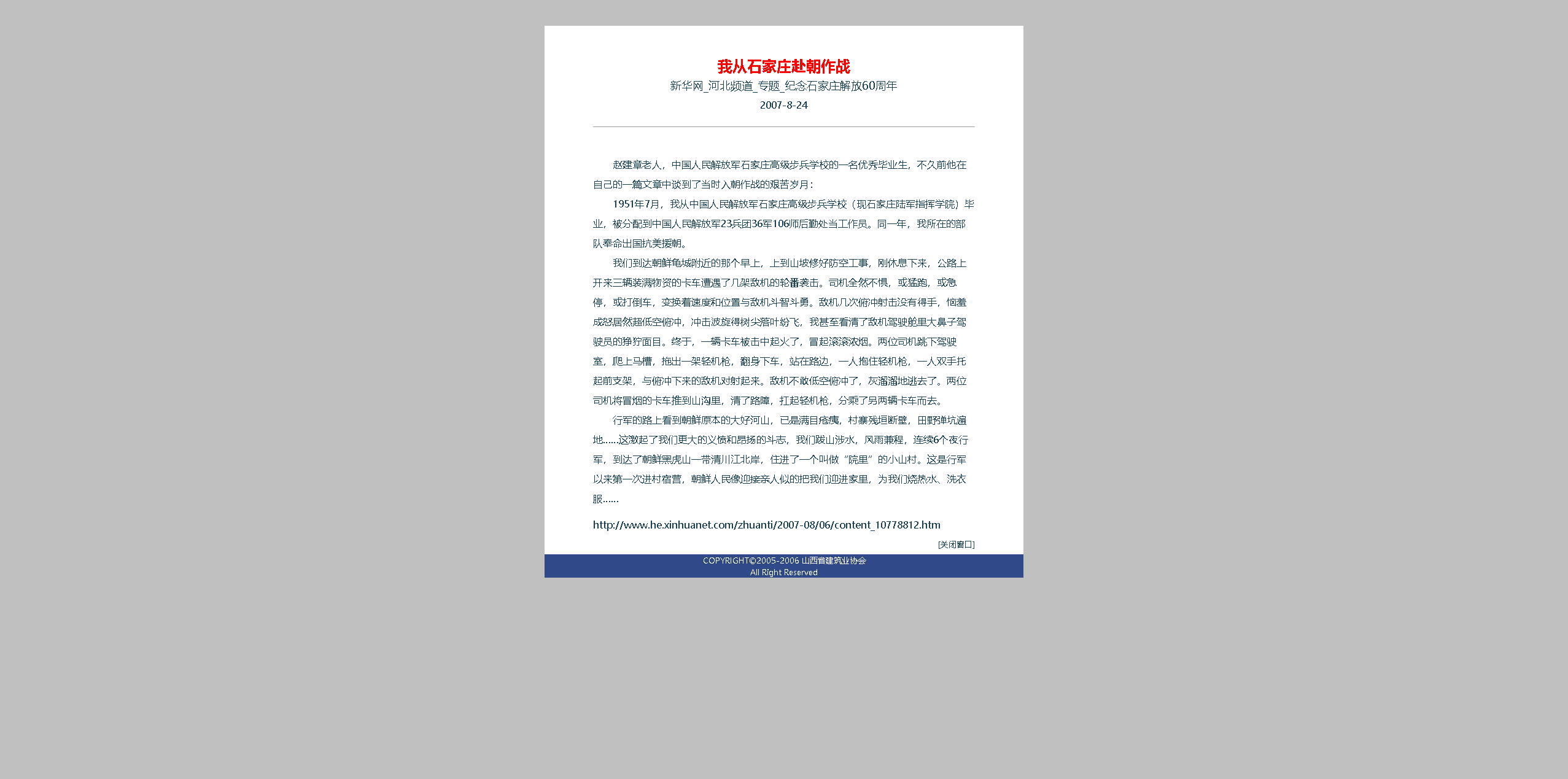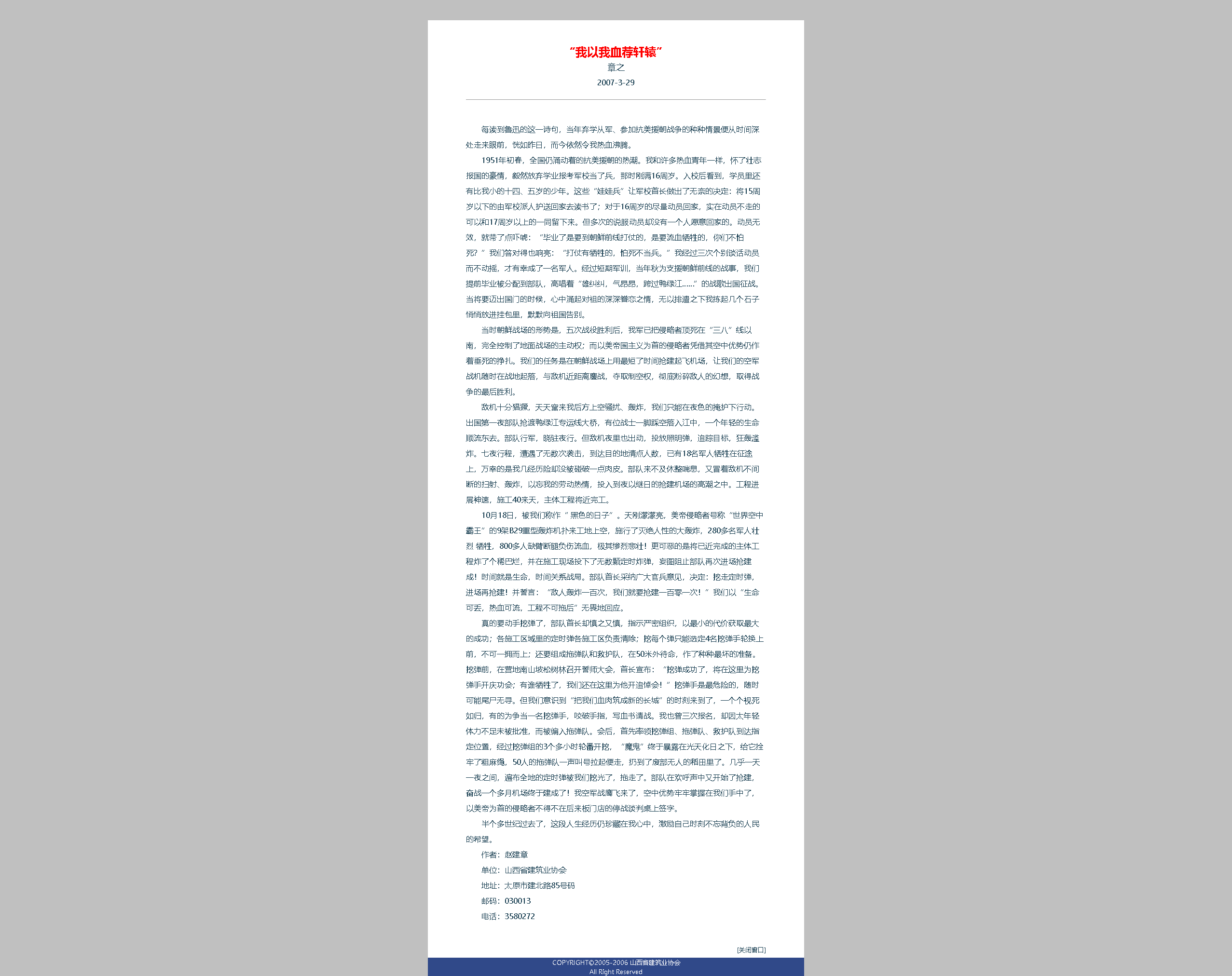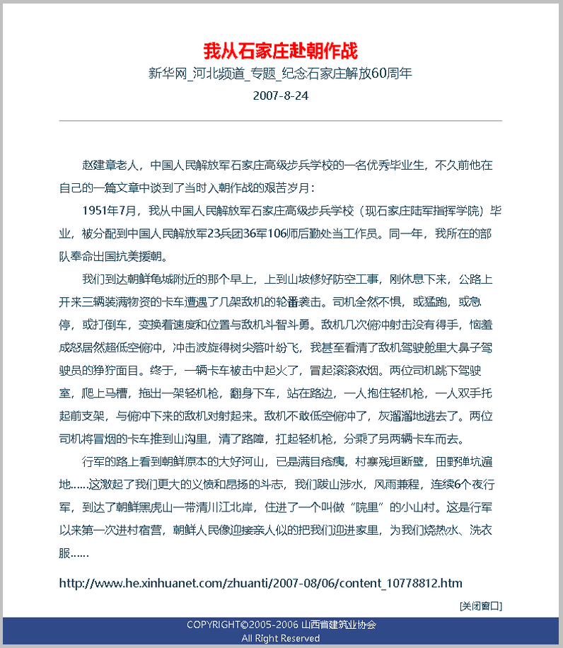 下面三篇文章,是十六年前在建筑業(yè)協(xié)會時,發(fā)表在協(xié)會網(wǎng)上的若干文章,證明一個抗美援朝老兵的回憶錄。