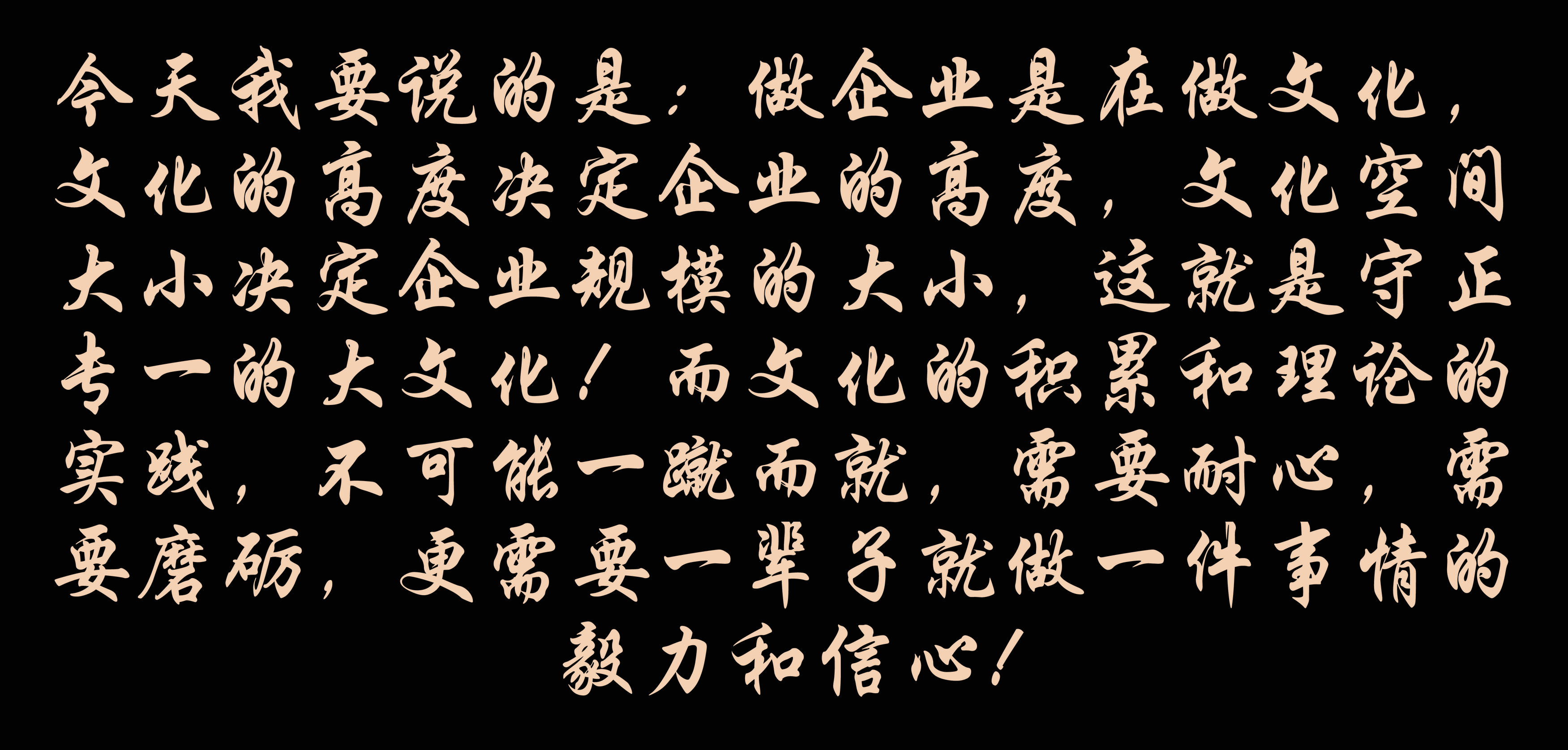 今天我要說的是:做企業(yè)是在做文化,文化的高度決定企業(yè)的高度,文化空間大小決定企業(yè)規(guī)模的大小,這就是守正專一的大文化!而文化的積累和理論的實(shí)踐,不可能一蹴而就,需要耐心,需要磨礪,更需要一輩子就做一件事情的毅力和信心!