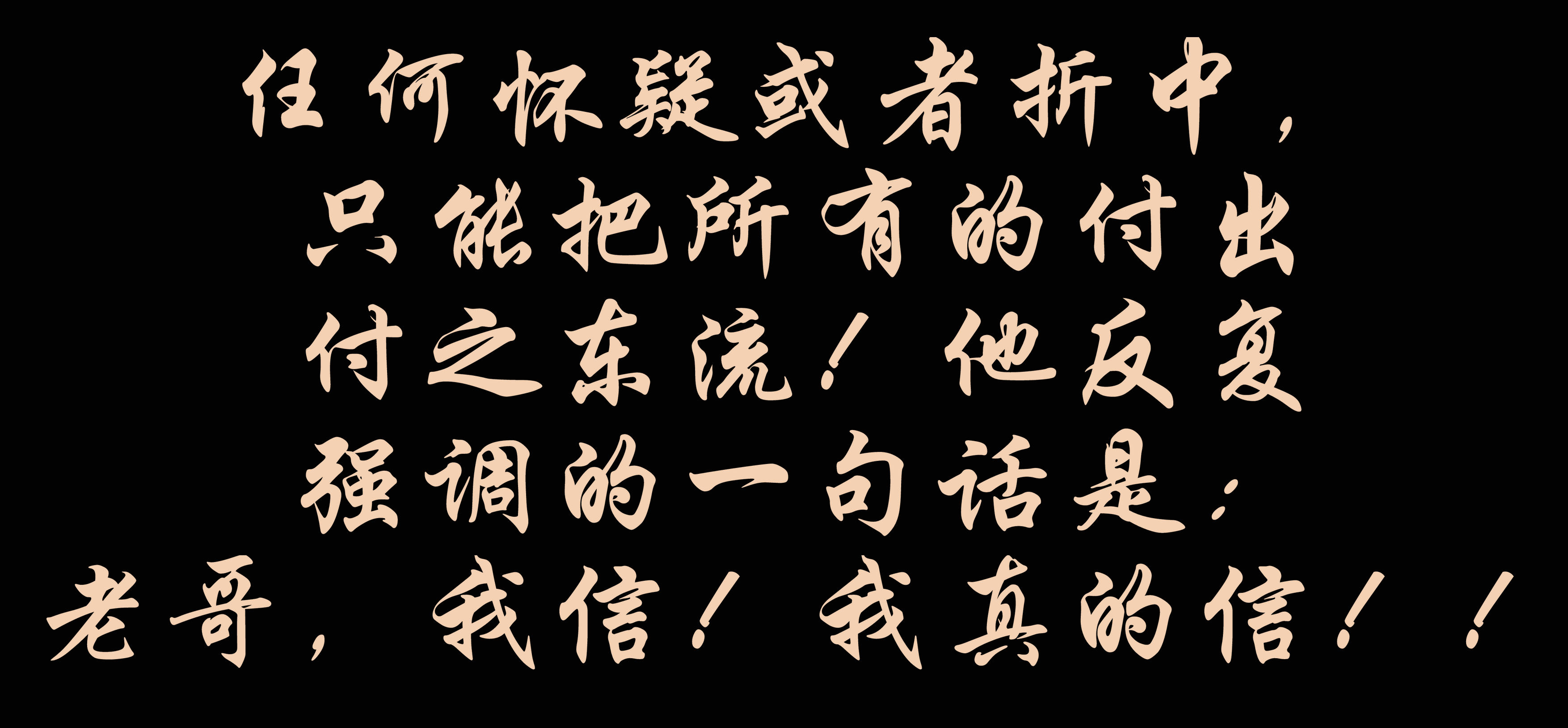 任何懷疑或者折中,只能把所有的付出付之東流!他反復(fù)強(qiáng)調(diào)的一句話是:老哥,我信!我真的信??!