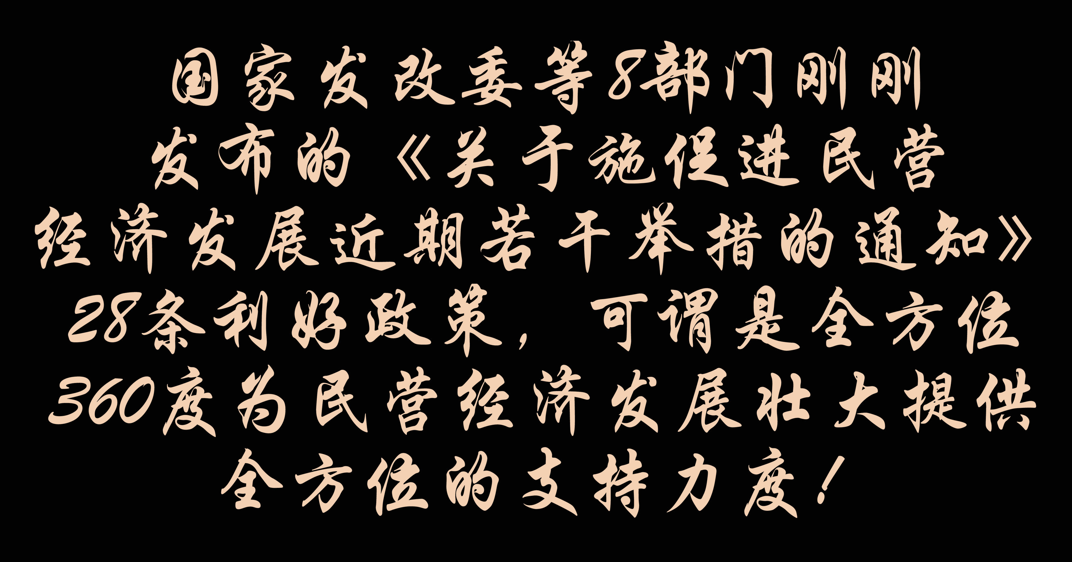 國家發(fā)改委等8部門剛剛發(fā)布的《關(guān)于實(shí)施促進(jìn)民營經(jīng)濟(jì)發(fā)展近期若干舉措的通知》28條利好政策,可謂是全方位360度為民營經(jīng)濟(jì)發(fā)展壯大提供全方位支持的力度,對(duì)于民營企業(yè)來說可謂是千載難逢的機(jī)遇期,對(duì)于民營企業(yè)家來說可謂是定心丸和助跑器,把做大做強(qiáng)自己的企業(yè)作為一種使命和任務(wù),這才是對(duì)國家和民族義不容辭的責(zé)任的最好行動(dòng)!