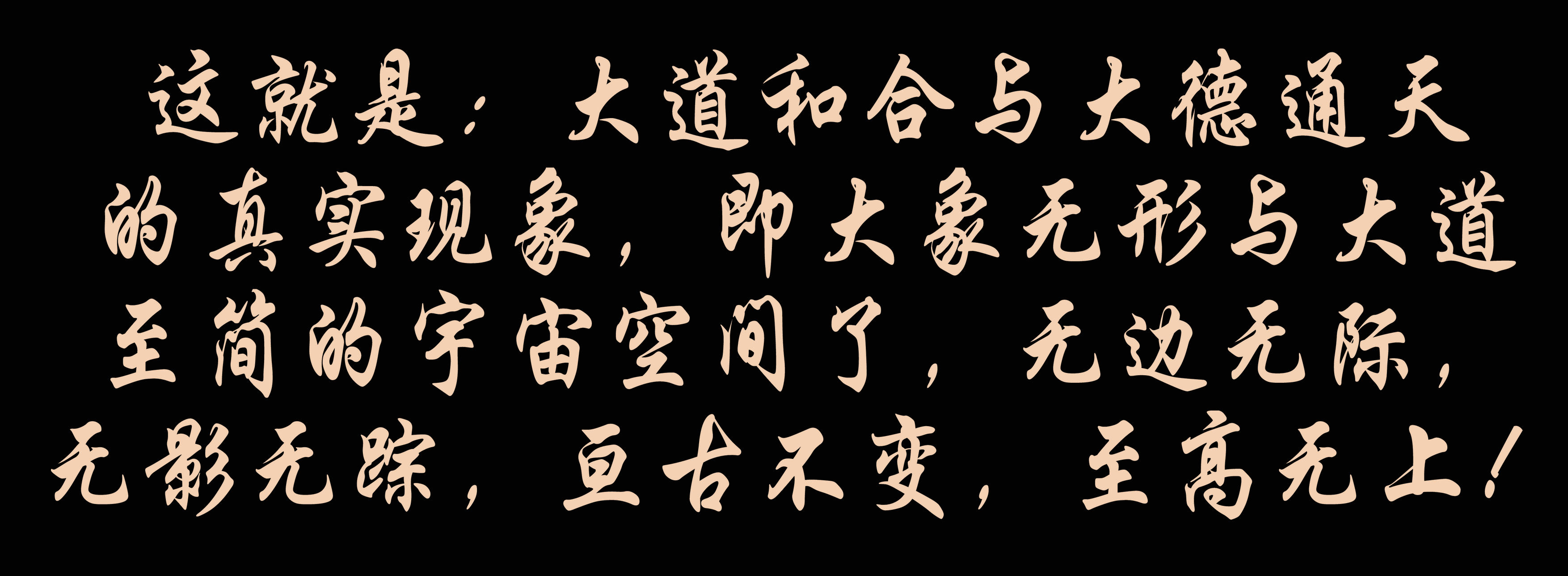 這就是:大道和合與大德通天的真實(shí)現(xiàn)象,即大象無形與大道至簡(jiǎn)的宇宙空間了,無邊無際,無影無蹤,亙古不變,至高無上!