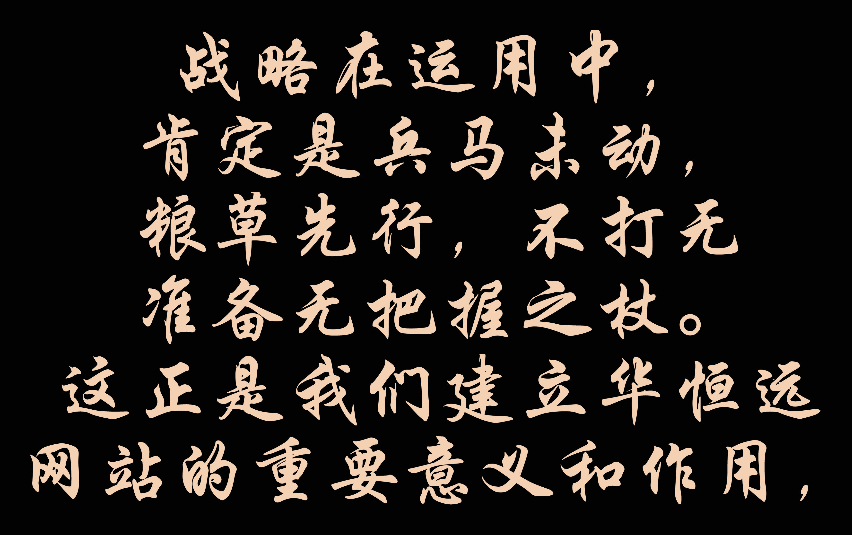 戰(zhàn)略在運用中,肯定是兵馬未動,糧草先行,不打無準備無把握之杖。這正是我們建立華恒遠網(wǎng)站的重要意義和作用,讓更多層面更多層次的瀏覽者,知道華恒遠,喜歡華恒遠,就已經(jīng)達到了戰(zhàn)略發(fā)展的第一步,那么第二步就好邁開了!三年時間,人們自然而然接受華恒遠,你們可是要出大名的,那個時候,才會真正懂得什么是戰(zhàn)略,才會自覺自愿加入到開發(fā)網(wǎng)站的行動之中,那就到了網(wǎng)站改版的必須空間了!