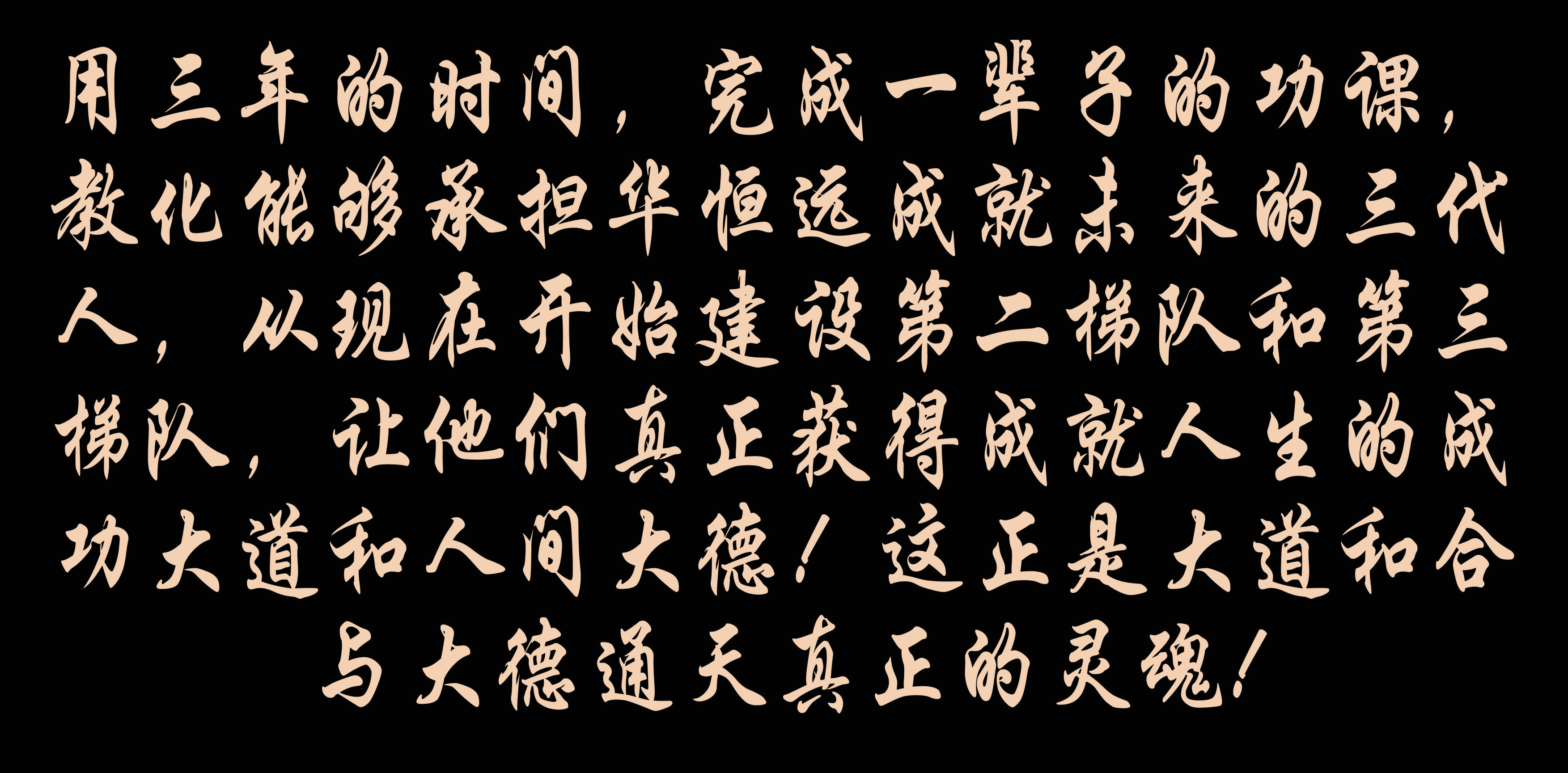 我計(jì)劃用三年的時(shí)間,完成一輩子的功課,教化能夠承擔(dān)華恒遠(yuǎn)成就未來的三代人,從現(xiàn)在開始建設(shè)第二梯隊(duì)和第三梯隊(duì),讓他們真正獲得成就人生的成功大道和人間大德!這正是大道和合與大德通天真正的靈魂!