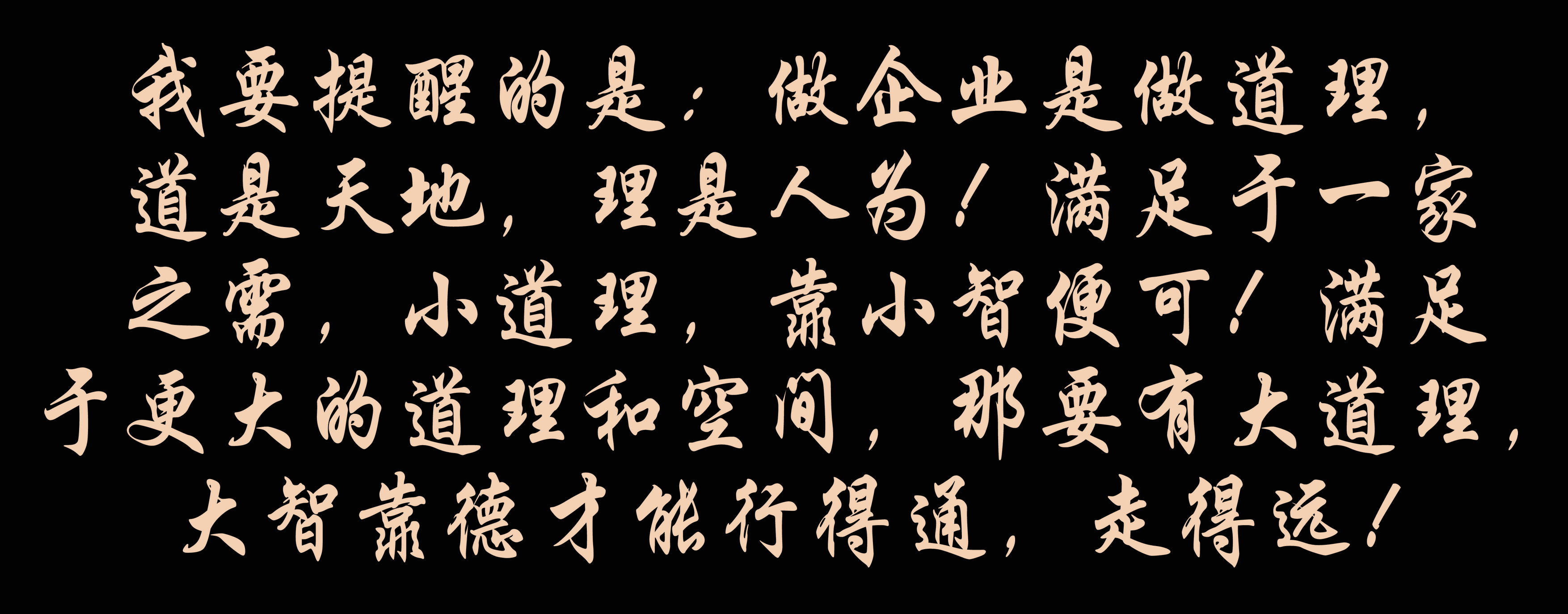 我要提醒的是:做企業(yè)是做道理,道是天地,理是人為!滿足于一家之需,小道理,靠小智便可!滿足于更大的道理和空間,那要有大道理,大智靠德才能行得通,走得遠!