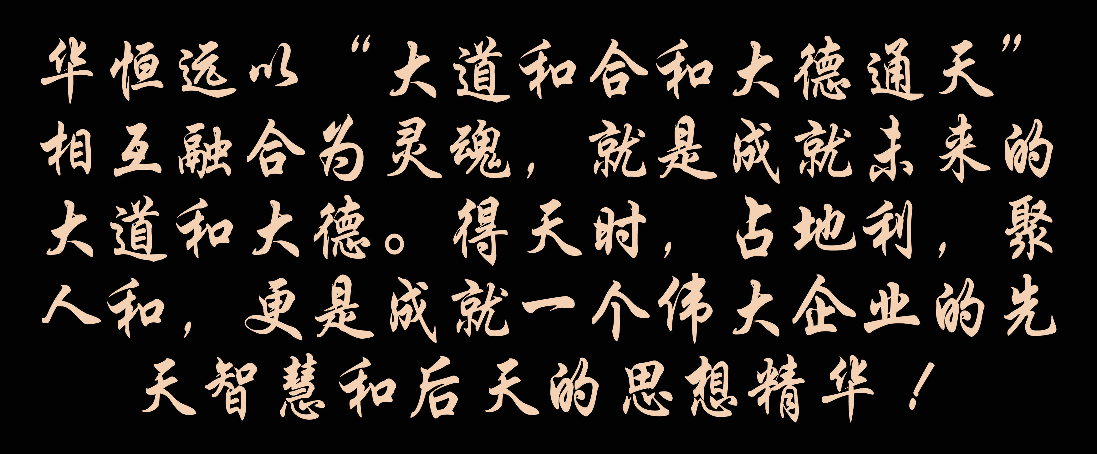 華恒遠以“大道和合和大德通天”相互融合為靈魂,就是成就未來的大道和大德。得天時,占地利,聚人和,更是成就一個偉大企業(yè)的先天智慧和后天的思想精華 !