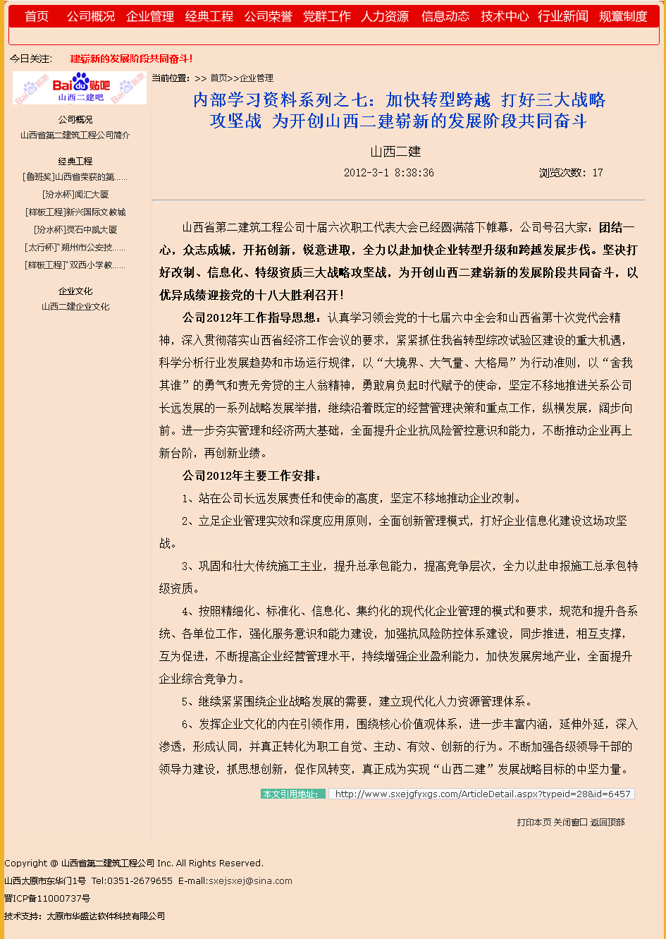 2、定位于立足企業(yè),著眼行業(yè),服務(wù)社會(huì),以一流的信息服務(wù),打造行業(yè)品牌網(wǎng)站,全面塑造“山西二建”行業(yè)品牌新形象的“山西二建”網(wǎng)站正式運(yùn)行。