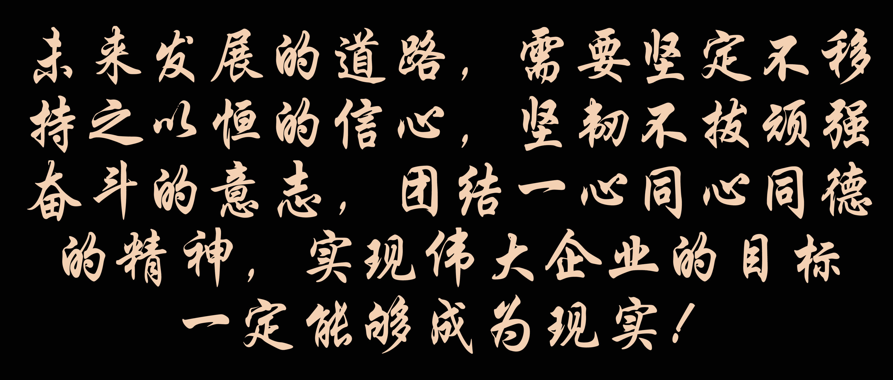 未來發(fā)展的道路,需要堅定不移持之以恒的信心,堅韌不拔頑強奮斗的意志,團結一心同心同德的精神,實現(xiàn)偉大企業(yè)的目標一定能夠成為現(xiàn)實!