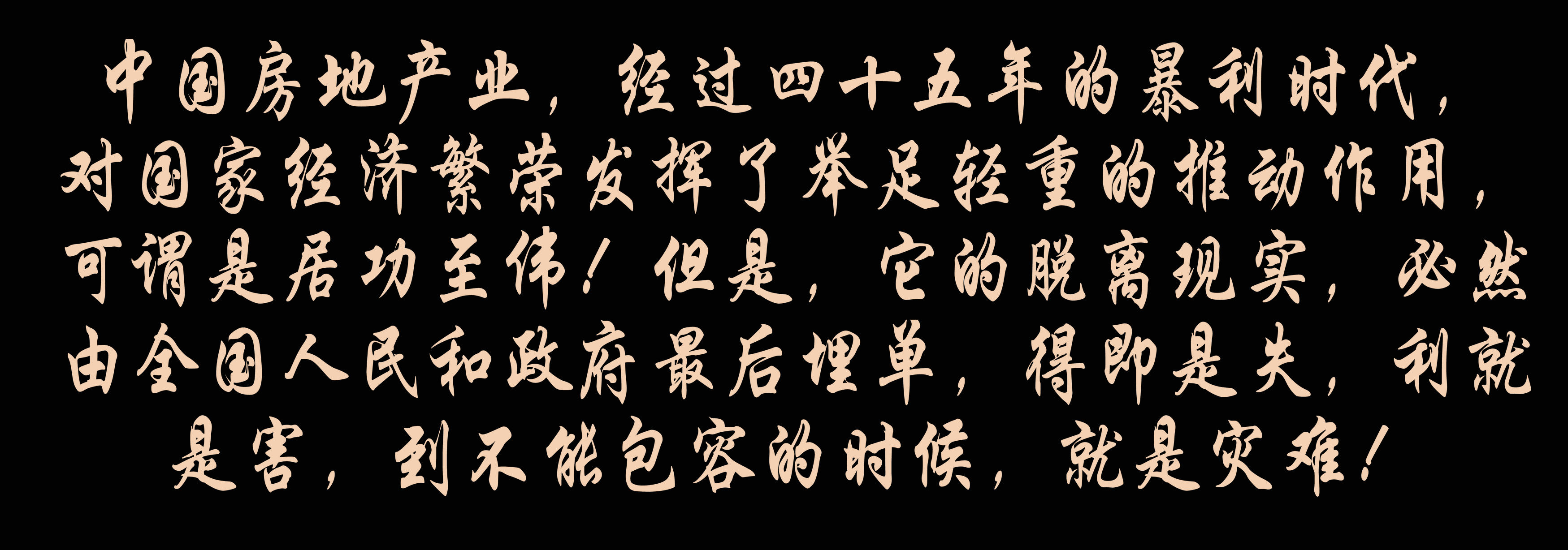 中國房地產(chǎn)業(yè),經(jīng)過四十五年的暴利時(shí)代,對國家經(jīng)濟(jì)繁榮發(fā)揮了舉足輕重的推動(dòng)作用,可謂是居功至偉!但是,它的脫離現(xiàn)實(shí),必然由全國人民和政府最后埋單,得即是失,利就是害,到不能包容的時(shí)候,就是災(zāi)難!