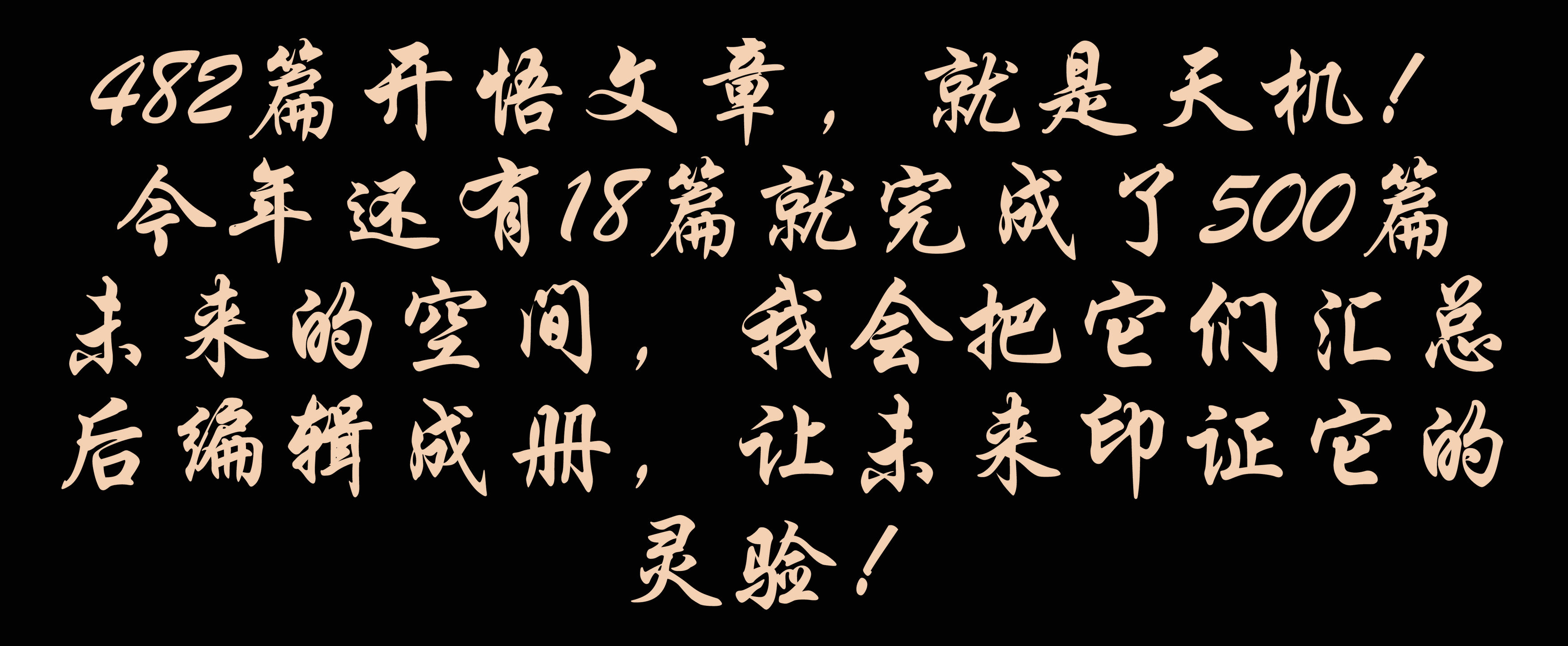 482篇開悟文章,就是天機(jī)!今年還有18篇就完成了500篇未來(lái)的空間,我會(huì)把它們匯總后編輯成冊(cè),讓未來(lái)印證它的靈驗(yàn)!