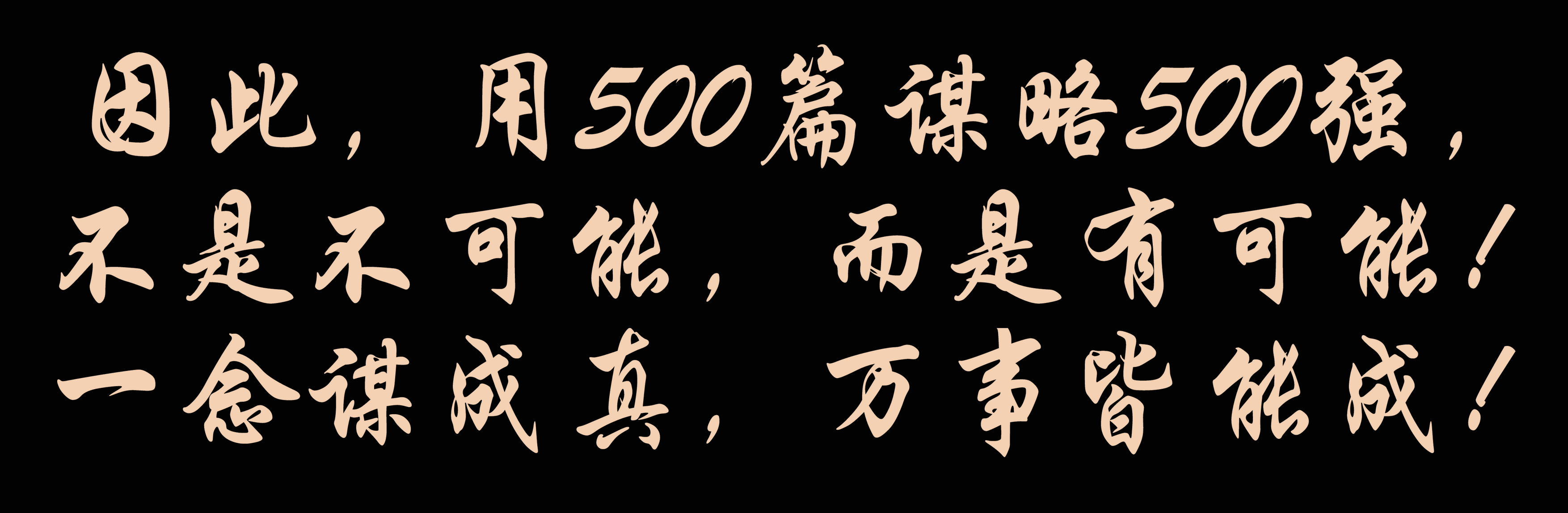 因此,用500篇謀略500強,不是不可能,而是有可能!一念謀成真,萬事皆能成!