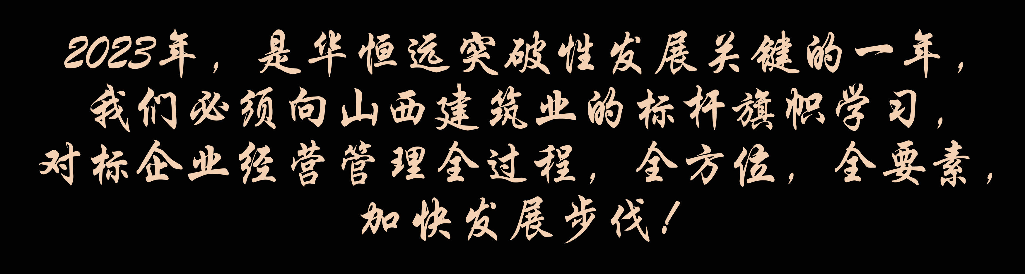 2023年,是華恒遠(yuǎn)突破性發(fā)展關(guān)鍵的一年,我們必須向山西建筑業(yè)的標(biāo)桿旗幟學(xué)習(xí),對(duì)標(biāo)企業(yè)經(jīng)營(yíng)管理全過(guò)程,全方位,全要素,加快發(fā)展步伐!