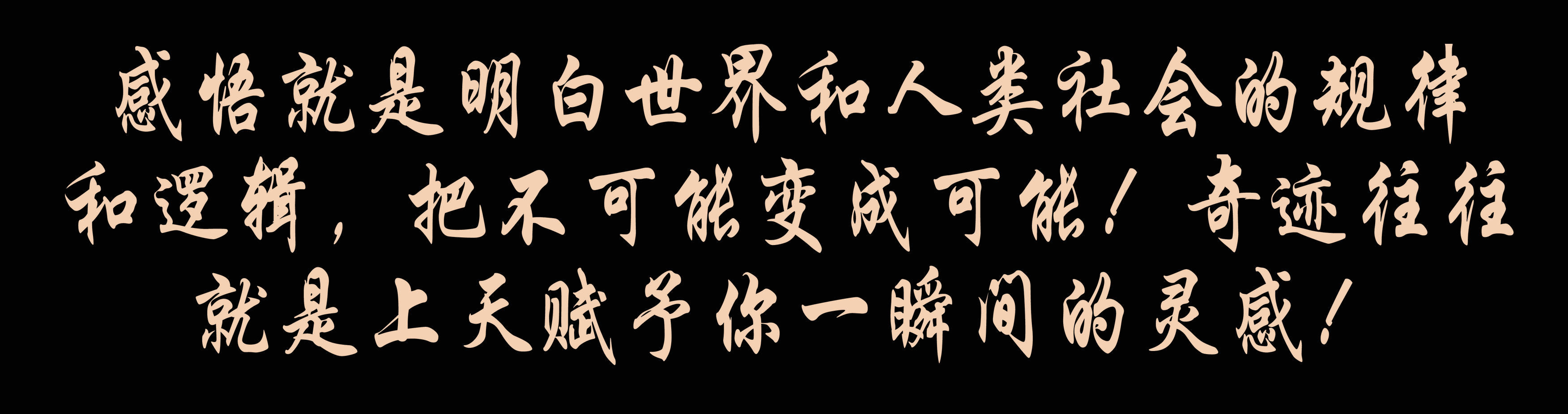 感悟就是明白世界和人類社會的規(guī)律和邏輯,把不可能變成可能!奇跡往往就是上天賦予你一瞬間的靈感! 這是我一個輪回六十年最大的感悟,感應和靈感!