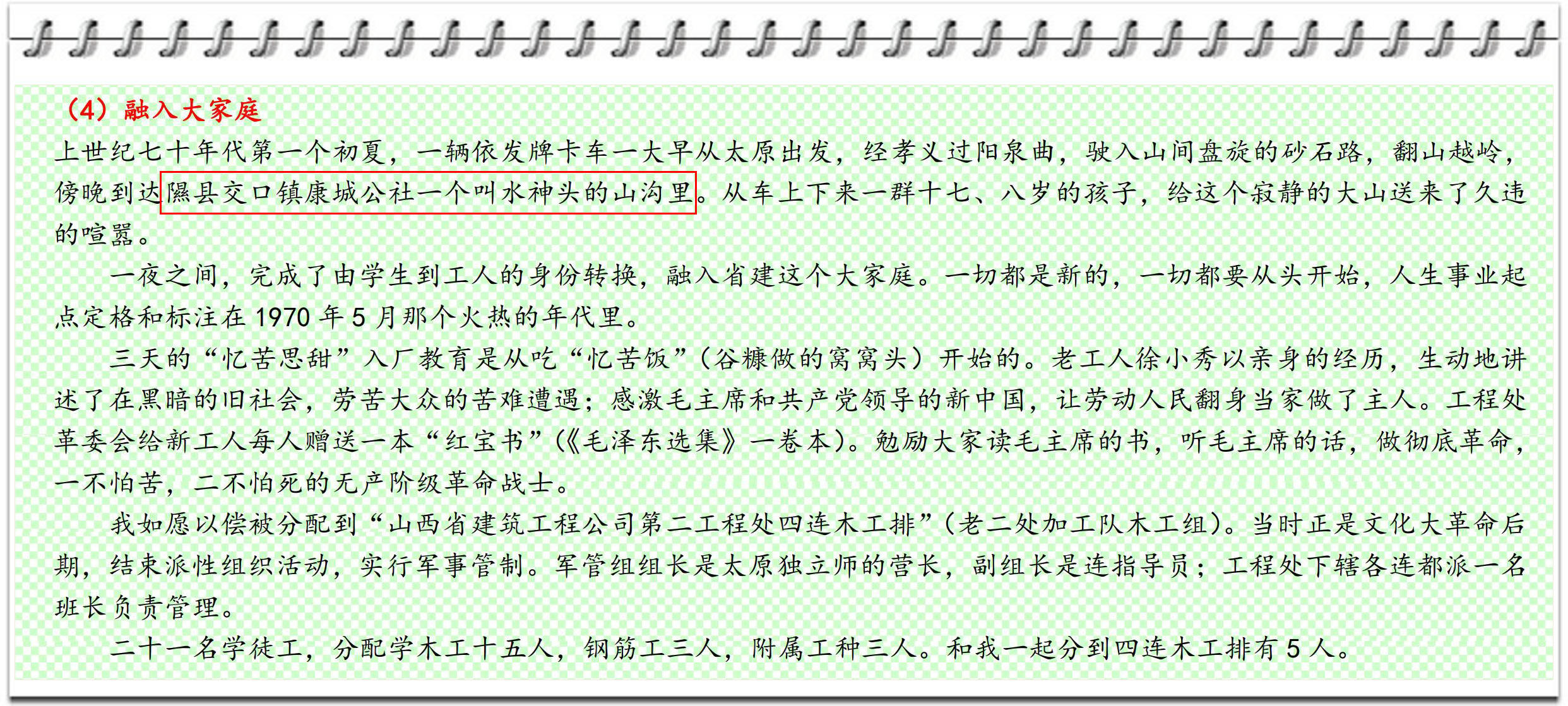 下面衛(wèi)星圖中圈的地方,西北面石槽平因一眼泉水和石槽平而得名,位于山間小道路旁。杏胡和克胡則是兩個自然村。哪里的村民純樸善良,看到我們進村,都站在家門口觀望,大姑娘小媳婦穿著牡丹花被面那種布的衣服,別有一番風趣。在城市長大的我,第一次看到這樣的著裝,可謂是聞所未聞!老鄉(xiāng)看到我和同伴抬頭看樹上黃橙橙的杏子,立刻拿一根長長的竹桿,噼里啪啦一陣子打的杏兒啪、啪落了一地,“吃呀!”他說。給人家錢,說什么都不要!一塊錢,核桃100個,雞蛋20個,我倆滿載而歸!水神頭往東北4里,是行政村解家坪,飯店、百貨商店、郵局、理發(fā)店一應俱全。這是我和師傅、師弟,星期天經常光顧的地方,吃頓飯,買些日用品,少不了提個生豬頭回來,那是上海楊老師傅的最愛!往正東10里地的康城鎮(zhèn),那是回太原的必經之路,少不了在鎮(zhèn)上買一些太原市買不到的汾酒、竹葉青酒,大前門煙,孝敬父親;還有給小外甥女的奶粉和白糖。附帶核桃,雞蛋這些太原的稀罕物。