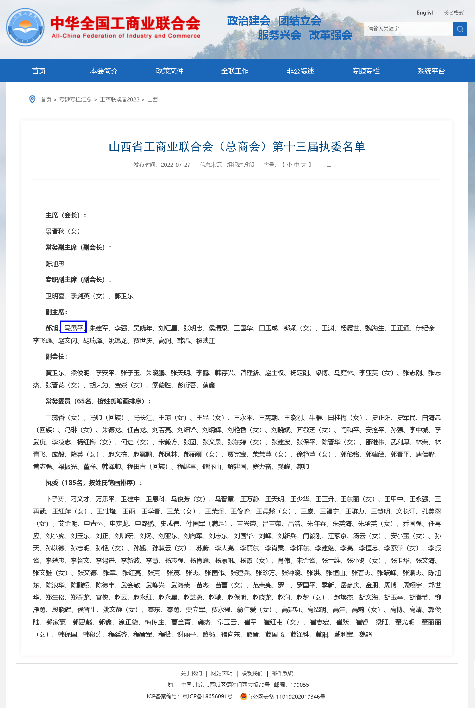 第十三屆山西省工商聯(lián)主席、總商會(huì)會(huì)長(zhǎng)