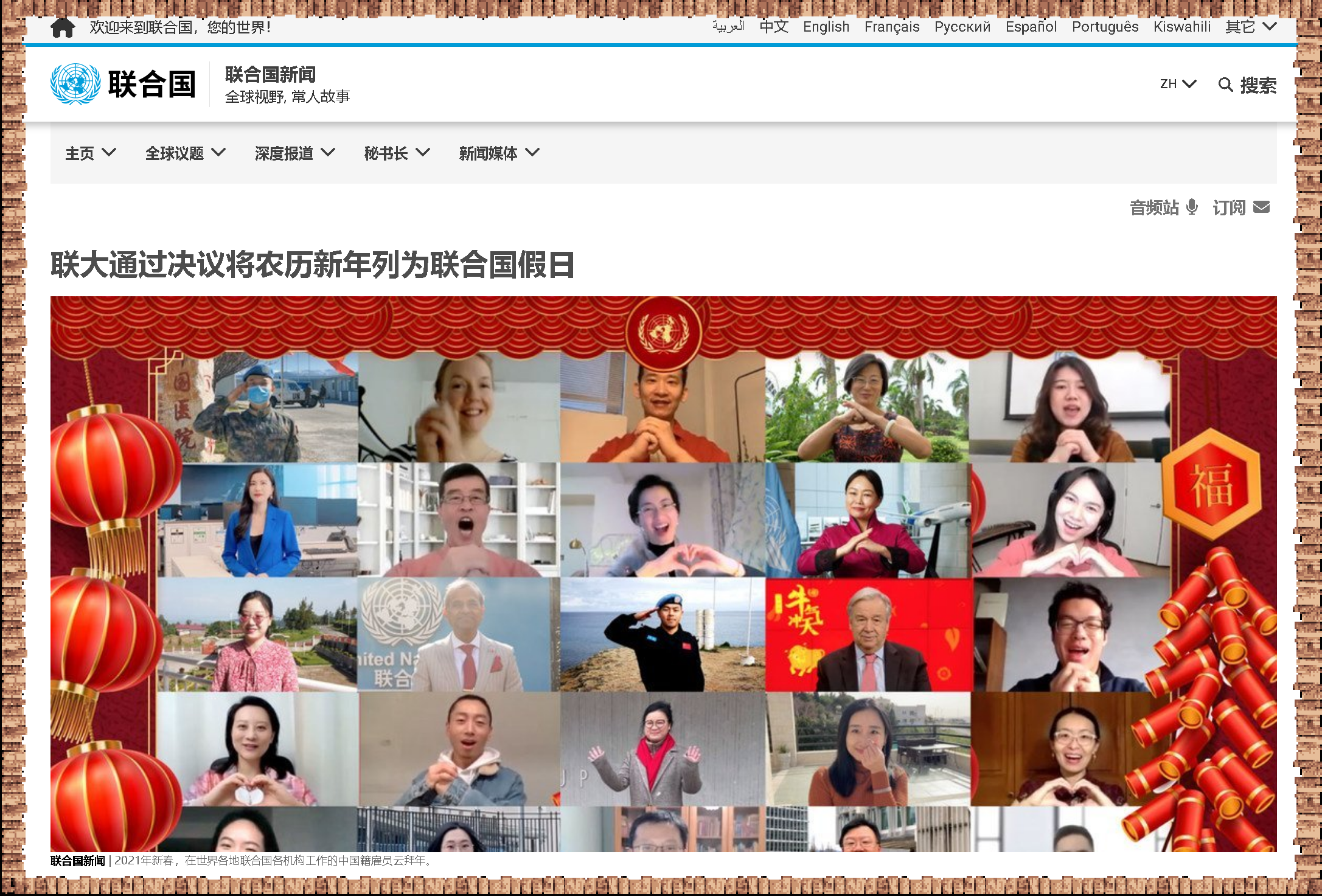 新華社北京12月24日電 日前,聯(lián)合國(guó)大會(huì)通過(guò)決議,將春節(jié)(農(nóng)歷新年)確定為聯(lián)合國(guó)假日。中國(guó)常駐聯(lián)合國(guó)代表團(tuán)臨時(shí)代辦戴兵說(shuō),聯(lián)大決議將春節(jié)確定為聯(lián)合國(guó)假日,得到了聯(lián)合國(guó)會(huì)員國(guó)和聯(lián)合國(guó)秘書(shū)處工作人員的熱烈歡迎和踴躍支持。春節(jié)歷史源遠(yuǎn)流長(zhǎng),起源于中國(guó),但已走向全世界,成為許多國(guó)家一年中最重要的節(jié)慶之一,一些國(guó)家還將其列入法定假日。