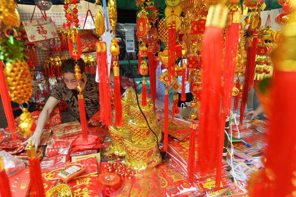 一名商販在泰國(guó)曼谷唐人街的攤位上擺放春節(jié)飾品。新華社發(fā)(拉亨攝)
