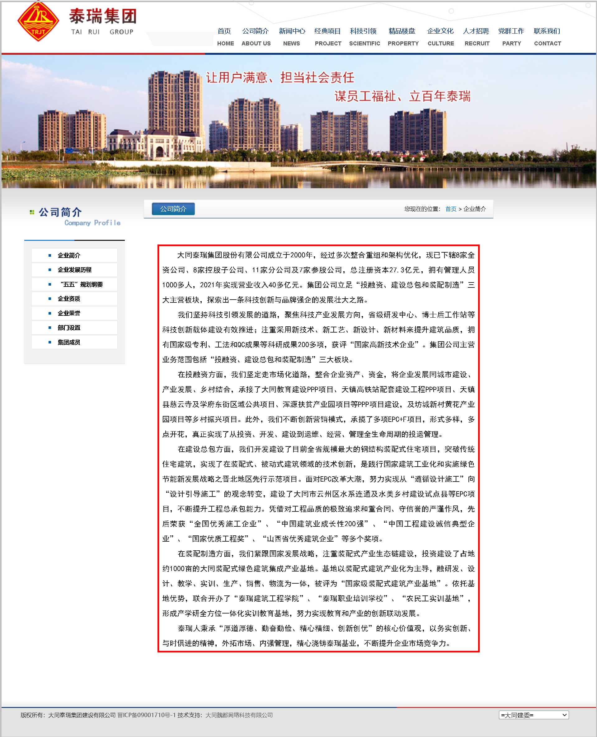 大同泰瑞集團(tuán)建設(shè)有限公司,經(jīng)過二十三年的拼搏奮斗,終于如愿以償進(jìn)入了全國建筑行業(yè)高端行列,成為特級(jí)資質(zhì)的大企業(yè)、大集團(tuán)、大公司!
