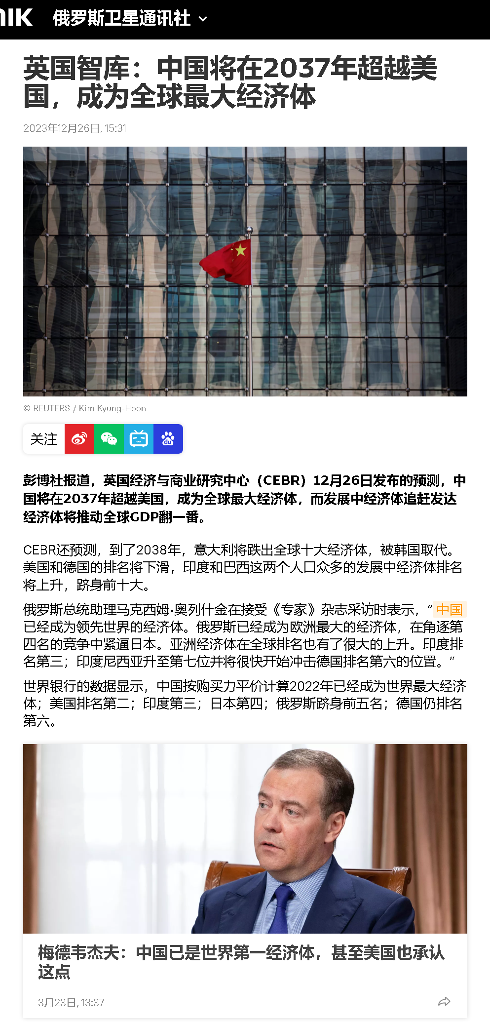 俄羅斯總統(tǒng)顧問馬克西姆·奧列什金在接受媒體采訪時表示:“中國已經(jīng)成為領先世界的經(jīng)濟體。俄羅斯已經(jīng)成為歐洲最大的經(jīng)濟體,在角逐全球第四名的競爭中緊逼日本。亞洲經(jīng)濟體在全球的排名也有了很大的上升。印度排名第三;印度尼西亞升至第七位并將很快開始沖擊德國排名第六的位置。”