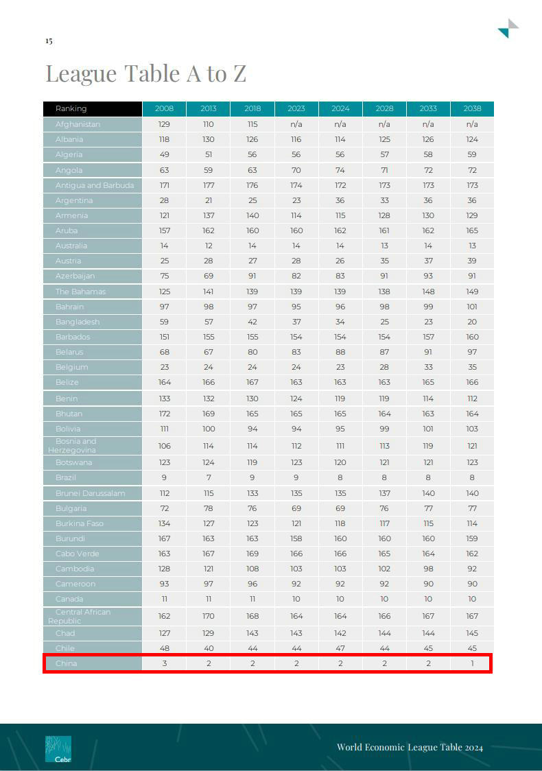 CEBR還預測,到2038年,意大利將跌出全球前十大經(jīng)濟體,被韓國取代。美國和德國的排名將下滑,印度和巴西這兩個人口眾多的發(fā)展中經(jīng)濟體排名將上升,躋身前十大經(jīng)濟體之列。