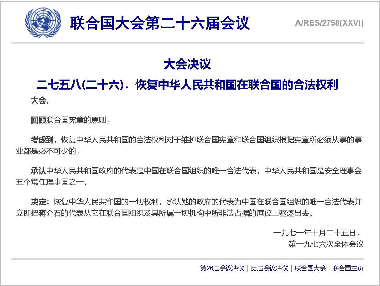 紐約曼哈頓東河之濱,聯(lián)合國總部,當(dāng)?shù)貢r(shí)間1971年10月25日晚,這是一個(gè)載入新中國外交史冊的重要時(shí)刻。76票贊成、35票反對、17票棄權(quán),第二十六屆聯(lián)合國大會以壓倒性多數(shù)通過2758號決議,恢復(fù)中華人民共和國在聯(lián)合國的一切合法權(quán)利,并立即把臺灣國民黨當(dāng)局的代表從聯(lián)合國的一切機(jī)構(gòu)中驅(qū)逐出去。習(xí)近平總書記深刻指出:“1971年,中國恢復(fù)在聯(lián)合國的合法席位、重返日內(nèi)瓦國際機(jī)構(gòu)后,逐步參與裁軍、經(jīng)貿(mào)、人權(quán)、社會等各領(lǐng)域事務(wù),為重大問題解決和重要規(guī)則制定提供了中國方案?!?