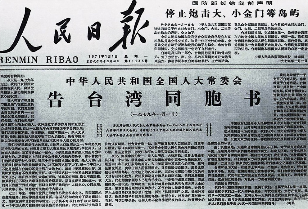 1979年元旦,中國(guó)同美國(guó)正式建立外交關(guān)系。同日,全國(guó)人大常委會(huì)發(fā)表《告臺(tái)灣同胞書(shū)》,正式提出實(shí)現(xiàn)和平統(tǒng)一的大政方針;時(shí)任國(guó)防部長(zhǎng)徐向前發(fā)表聲明,宣布停止自1958年以來(lái)解放軍對(duì)金門等島嶼的炮擊。