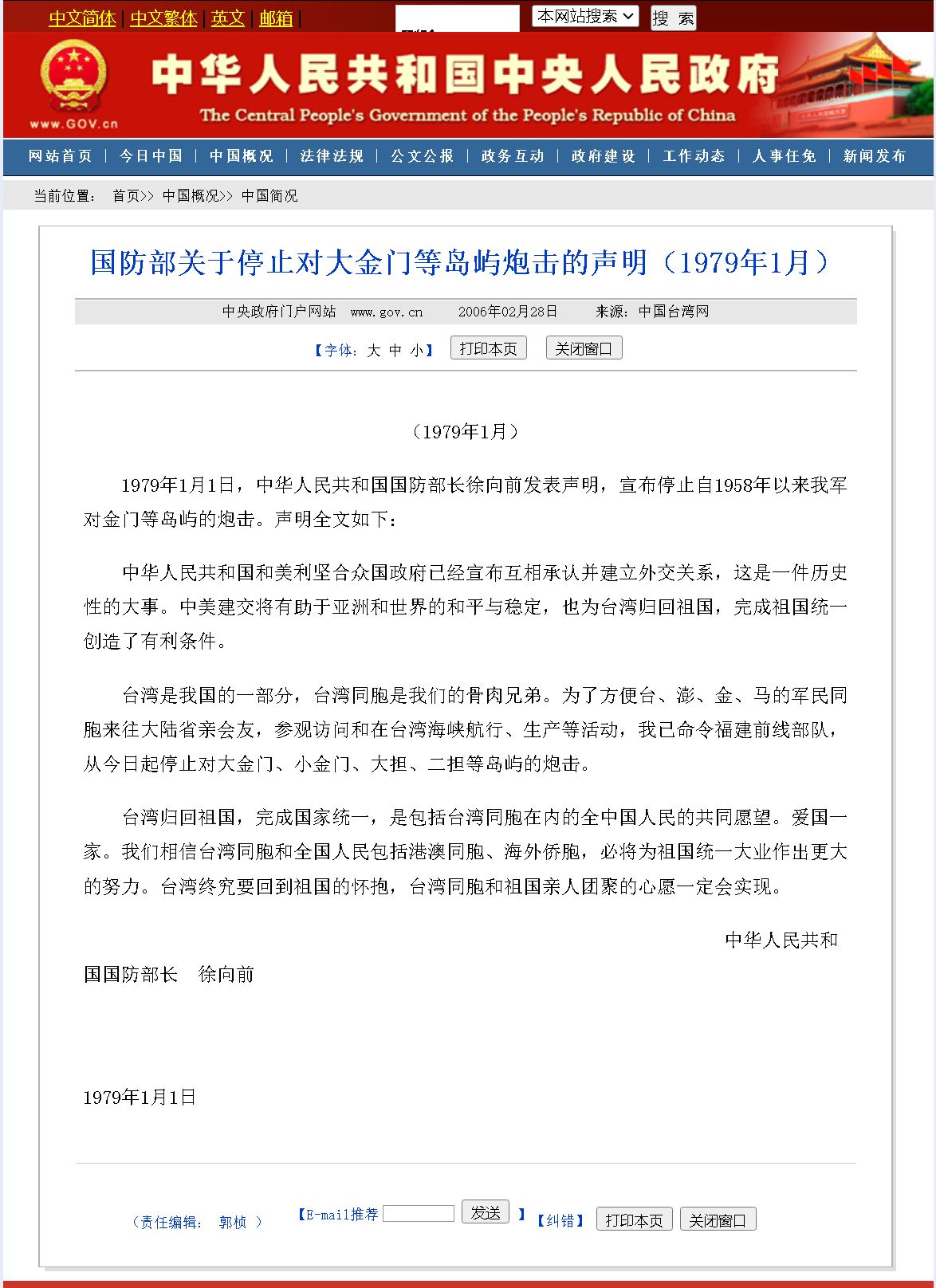 中國(guó)政府已經(jīng)命令人民解放軍從今天起停止對(duì)金門等島嶼的炮擊。臺(tái)灣海峽目前仍然存在著雙方的軍事對(duì)峙,這只能制造人為的緊張。我們認(rèn)為,首先應(yīng)當(dāng)通過(guò)中華人民共和國(guó)政府和臺(tái)灣當(dāng)局之間的商談結(jié)束這種軍事對(duì)峙狀態(tài),以便為雙方的任何一種范圍的交往接觸創(chuàng)造必要的前提和安全的環(huán)境。