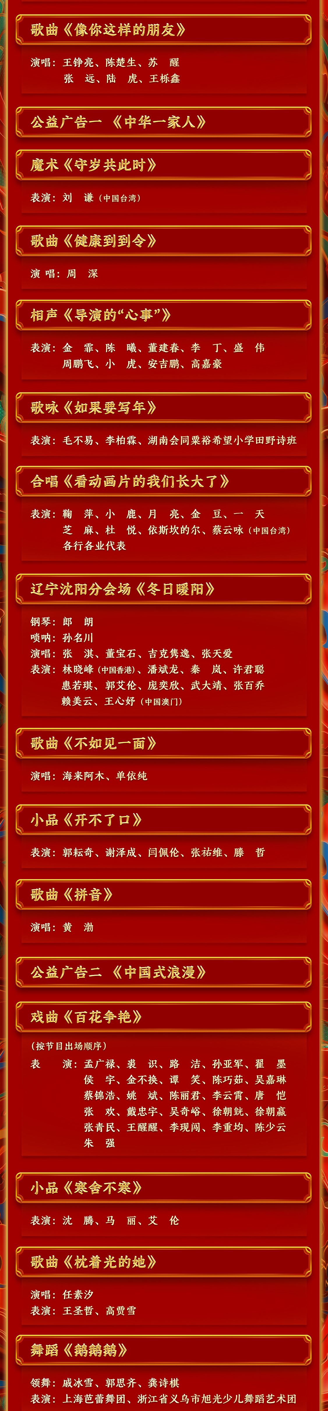 整臺(tái)晚會(huì)堅(jiān)持“歡樂(lè)吉祥、喜氣洋洋”的總目標(biāo),涵蓋歌曲、舞蹈、相聲、小品、戲曲、武術(shù)、魔術(shù)、雜技、音樂(lè)劇、微電影等各類(lèi)型節(jié)目,為全球華人奉上一道平實(shí)、喜慶、優(yōu)美的“文化大餐”。