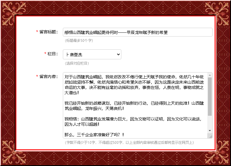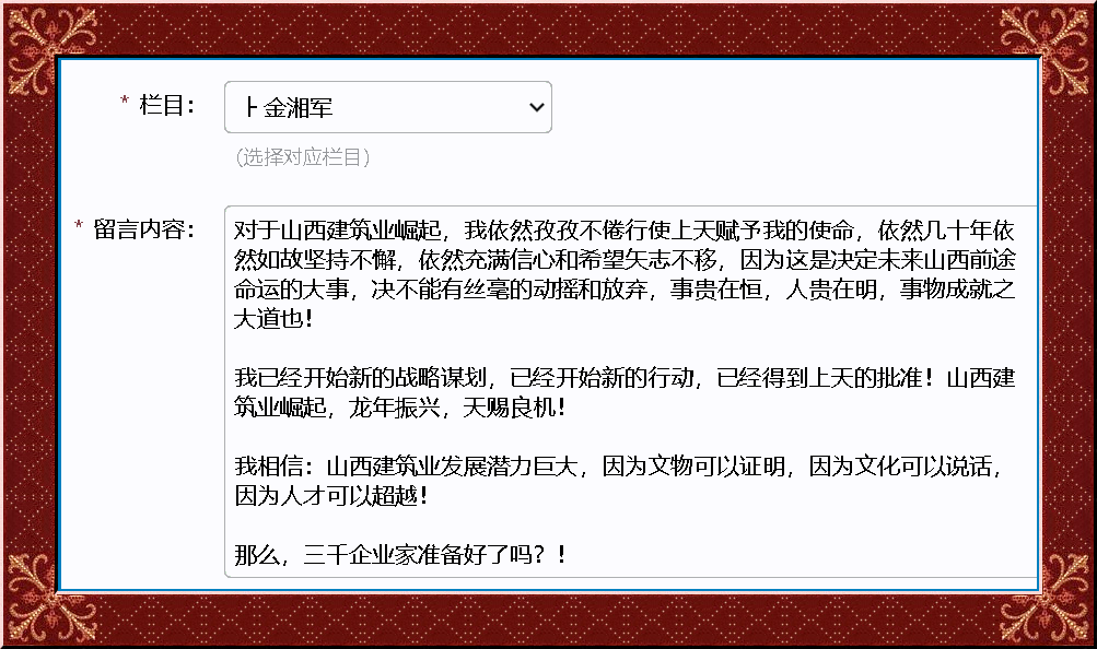 對于山西建筑業(yè)崛起,我依然孜孜不倦行使上天賦予我的使命,依然幾十年依然如故堅(jiān)持不懈,依然充滿信心和希望矢志不移,因?yàn)檫@是決定未來山西前途命運(yùn)的大事,決不能有絲毫的動搖和放棄,事貴在恒,人貴在明,事物成就之大道也!