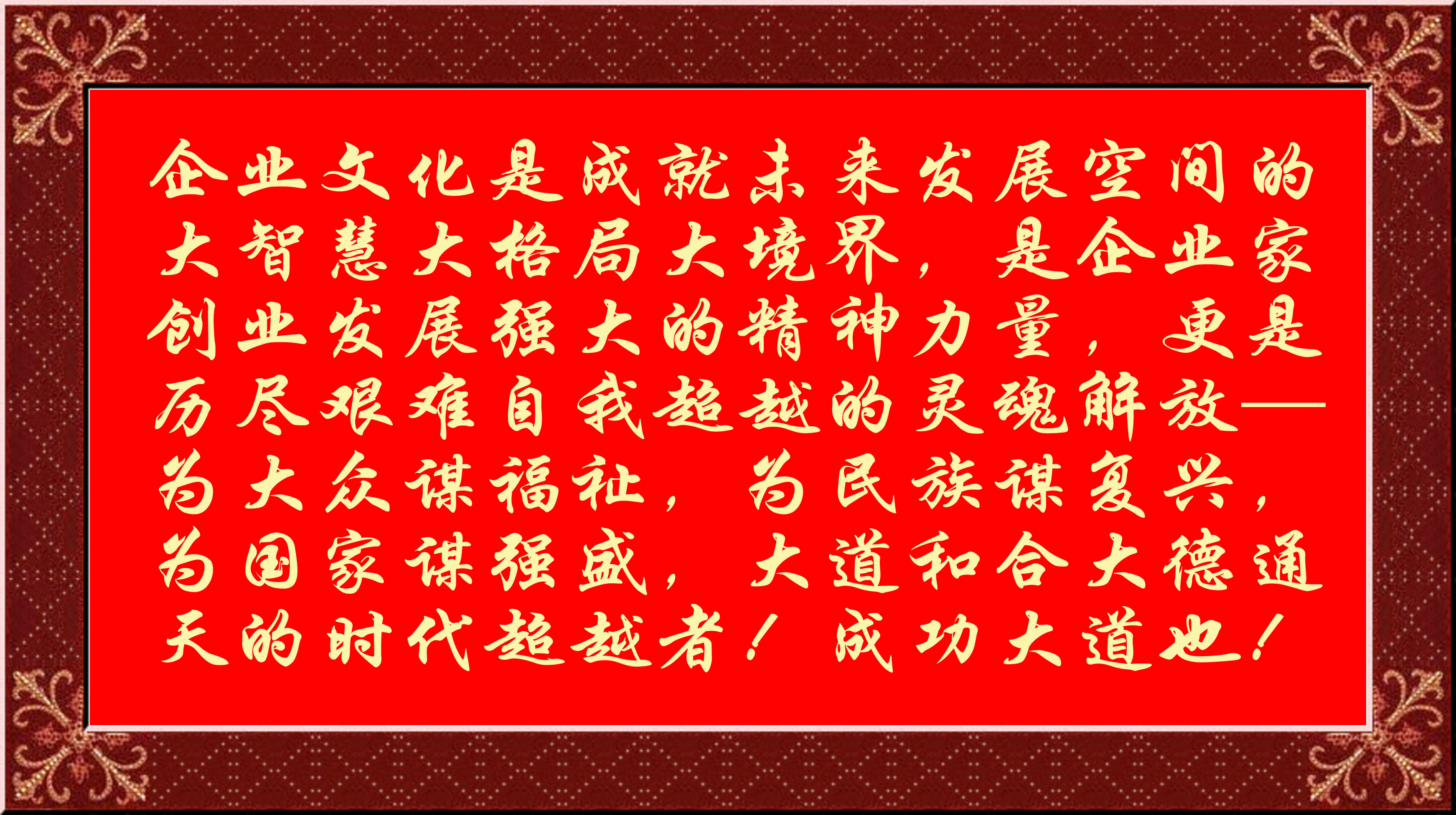 企業(yè)文化是成就未來發(fā)展空間的大智慧大格局大境界,是企業(yè)家創(chuàng)業(yè)發(fā)展強大的精神力量,更是歷盡艱難自我超越的靈魂解放——為大眾謀福祉,為民族謀復(fù)興,為國家謀強盛,大道和合大德通天的時代超越者!成功大道也!