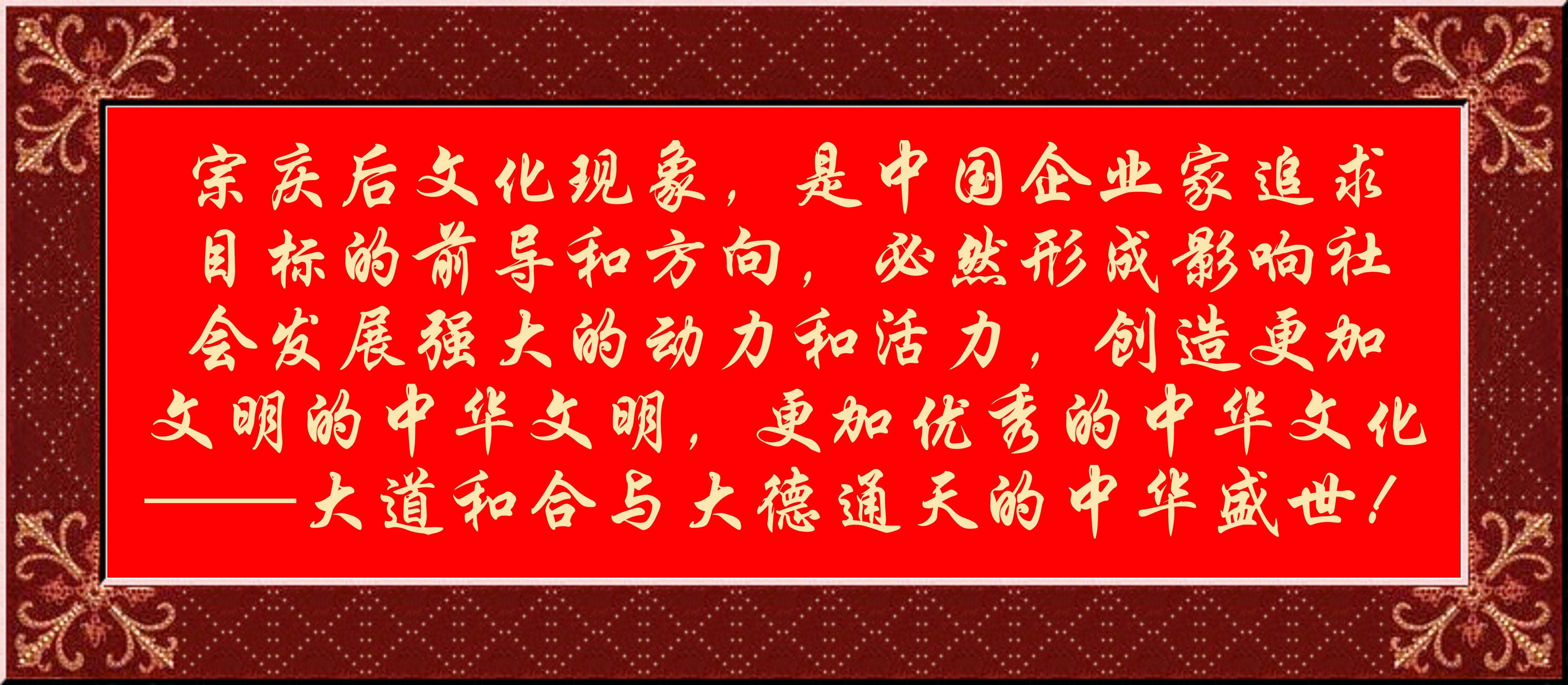 宗慶后文化現(xiàn)象,是中國企業(yè)家追求目標(biāo)的前導(dǎo)和方向,必然形成影響社會(huì)發(fā)展強(qiáng)大的動(dòng)力和活力,創(chuàng)造更加文明的中華文明,更加優(yōu)秀的中華文化——大道和合與大德通天的中華盛世!