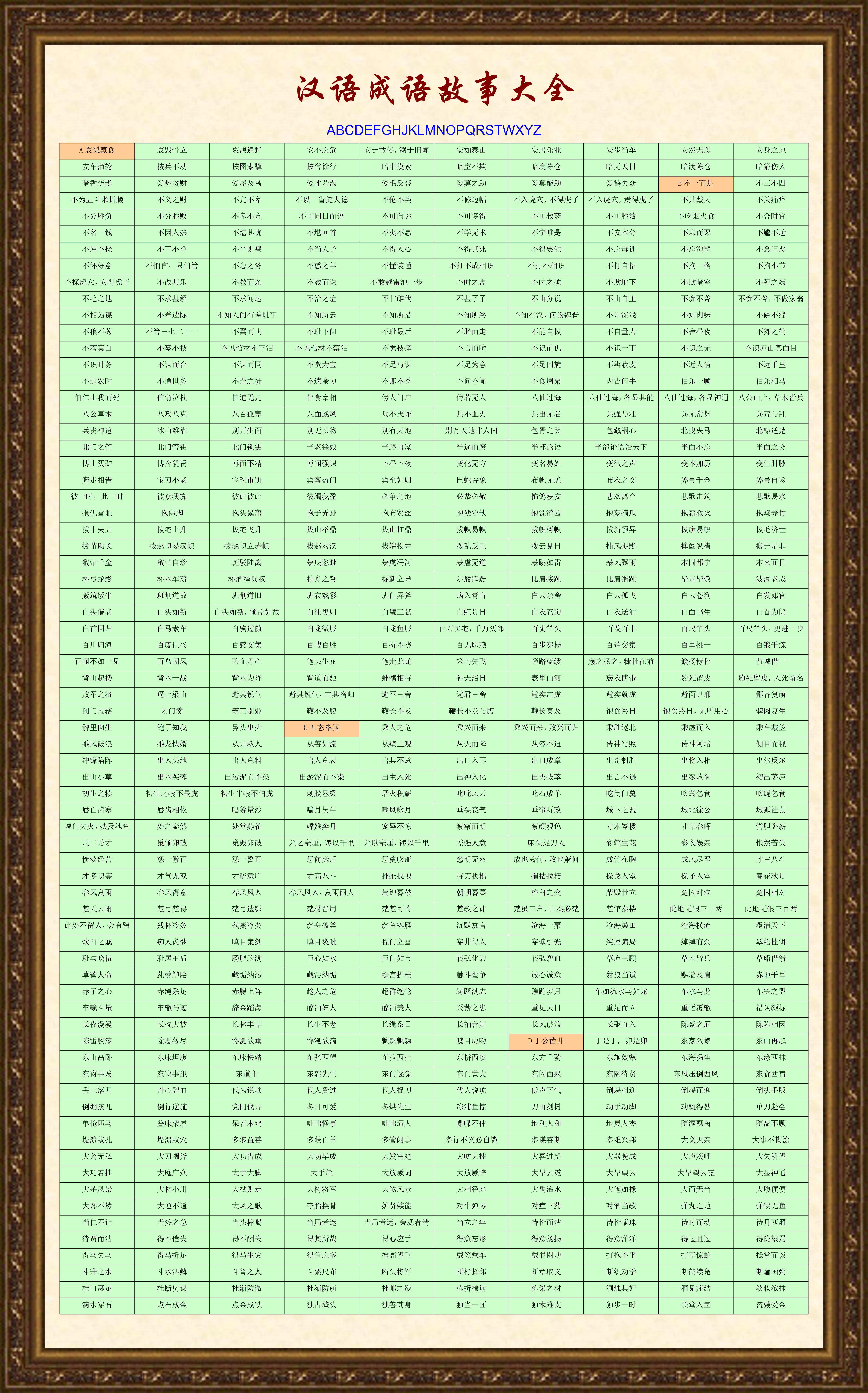 安如泰山 安居樂(lè)業(yè) 安步當(dāng)車 安然無(wú)恙 安身之地 安車蒲輪 按兵不動(dòng) 按圖索驥 按轡徐行 暗中摸索 暗室不欺 暗度陳倉(cāng) 暗無(wú)天日暗渡陳倉(cāng) 暗箭傷人 暗香疏影 愛(ài)勢(shì)貪財(cái) 愛(ài)屋及烏 愛(ài)才若渴 愛(ài)毛反裘 愛(ài)莫之助 愛(ài)莫能助 愛(ài)鶴失眾 B不一而足 不三不四 不為五斗米折腰 不義之財(cái) 不亢不卑 不以一眚掩大德 不倫不類 不修邊幅 不入虎穴,不得虎子 不入虎穴,焉得虎子 不共戴天 不關(guān)痛癢 不分勝負(fù) 不分勝敗 不卑不亢 不可同日而語(yǔ) 不可向邇 不可多得 不可救藥 不可勝數(shù) 不吃煙火食 不合時(shí)宜 不名一錢 不因人熱 不堪其憂 不堪回首 不夷不惠 不學(xué)無(wú)術(shù) 不寧唯是 不安本分 不寒而栗 不尷不尬 不屈不撓 不干不凈 不平則鳴 不當(dāng)人子 不得人心 不得其死 不得要領(lǐng) 不忘母訓(xùn) 不忘溝壑 不念舊惡 不懷好意 不怕官,只怕管 不急之務(wù) 不惑之年 不懂裝懂 不打不成相識(shí) 不打不相識(shí) 不打自招 不拘一格 不拘小節(jié) 不探虎穴,安得虎子 不改其樂(lè) 不教而殺 不教而誅 不敢越雷池一步 不時(shí)之需 不時(shí)之須 不欺地下 不欺暗室 不死之藥 不毛之地 不求甚解 不求聞達(dá) 不治之癥 不甘雌伏 不甚了了 不由分說(shuō) 不由自主 不癡不聾 不癡不聾,不做家翁 不相為謀 不著邊際 不知人間有羞恥事 不知所云 不知所措 不知所終 不知有漢,何論魏晉 不知深淺 不知肉味 不磷不緇 不稂不莠 不管三七二十一 不翼而飛 不恥下問(wèn) 不恥最后 不脛而走 不能自拔 不自量力 不舍晝夜 不舞之鶴 不落窠臼 不蔓不枝 不見(jiàn)棺材不下淚 不見(jiàn)棺材不落淚 不覺(jué)技癢 不言而喻 不記前仇 不識(shí)一丁 不識(shí)之無(wú) 不識(shí)廬山真面目 不識(shí)時(shí)務(wù) 不謀而合 不謀而同 不貪為寶 不足與謀 不足為意 不足回旋 不辨菽麥 不近人情 不遠(yuǎn)千里 不違農(nóng)時(shí) 不通世務(wù) 不逞之徒 不遺余力 不郎不秀 不問(wèn)不聞 不食周粟 丙吉問(wèn)牛 伯樂(lè)一顧 伯樂(lè)相馬 伯仁由我而死 伯俞泣杖 伯道無(wú)兒 伴食宰相 傍人門戶 傍若無(wú)人 八仙過(guò)海 八仙過(guò)海,各顯其能 八仙過(guò)海,各顯神通 八公山上,草木皆兵 八公草木 八攻八克 八百孤寒 八面威風(fēng) 兵不厭詐 兵不血刃 兵出無(wú)名 兵強(qiáng)馬壯 兵無(wú)常勢(shì) 兵荒馬亂 兵貴神速 冰山難靠 別開(kāi)生面 別無(wú)長(zhǎng)物 別有天地 別有天地非人間 包胥之哭 包藏禍心 北叟失馬 北轅適楚 北門之管 北門管鑰 北門鎖鑰 半老徐娘 半路出家 半途而廢 半部論語(yǔ) 半部論語(yǔ)治天下 半面不忘 半面之交 博士買驢 博弈猶賢 博而不精 博聞強(qiáng)識(shí) 卜晝卜夜 變化無(wú)方 變名易姓 變徵之聲 變本加厲 變生肘腋 奔走相告 寶刀不老 寶珠市餅 賓客盈門 賓至如歸 巴蛇吞象 布帆無(wú)恙 布衣之交 弊帚千金 弊帚自珍 彼一時(shí),此一時(shí) 彼眾我寡 彼此彼此 彼竭我盈 必爭(zhēng)之地 必恭必敬 怖鴿獲安 悲歡離合 悲歌擊筑 悲歌易水 報(bào)仇雪恥 抱佛腳 抱頭鼠竄 抱子弄孫 抱布貿(mào)絲 抱殘守缺 抱甕灌園 抱蔓摘瓜 抱薪救火 抱雞養(yǎng)竹 拔十失五 拔宅上升 拔宅飛升 拔山舉鼎 拔山扛鼎 拔幟易幟 拔幟樹(shù)幟 拔新領(lǐng)異 拔旗易幟 拔毛濟(jì)世 拔苗助長(zhǎng) 拔趙幟易漢幟 拔趙幟立赤幟 拔趙易漢 拔轄投井 撥亂反正 撥云見(jiàn)日 捕風(fēng)捉影 捭闔縱橫 搬弄是非 敝帚千金 敝帚自珍 斑駁陸離 暴戾恣睢 暴虎馮河 暴虐無(wú)道 暴跳如雷 暴風(fēng)驟雨 本固邦寧 本來(lái)面目 杯弓蛇影 杯水車薪 杯酒釋兵權(quán) 柏舟之誓 標(biāo)新立異 步履蹣跚 比肩接踵 比肩繼踵 畢恭畢敬 波瀾老成 版筑飯牛 班荊道故 班荊道舊 班衣戲彩 班門弄斧 病入膏肓 白云親舍 白云孤飛 白云蒼狗 白發(fā)郎官 白頭偕老 白頭如新 白頭如新,傾蓋如故 白往黑歸 白璧三獻(xiàn) 白虹貫日 白衣蒼狗 白衣送酒